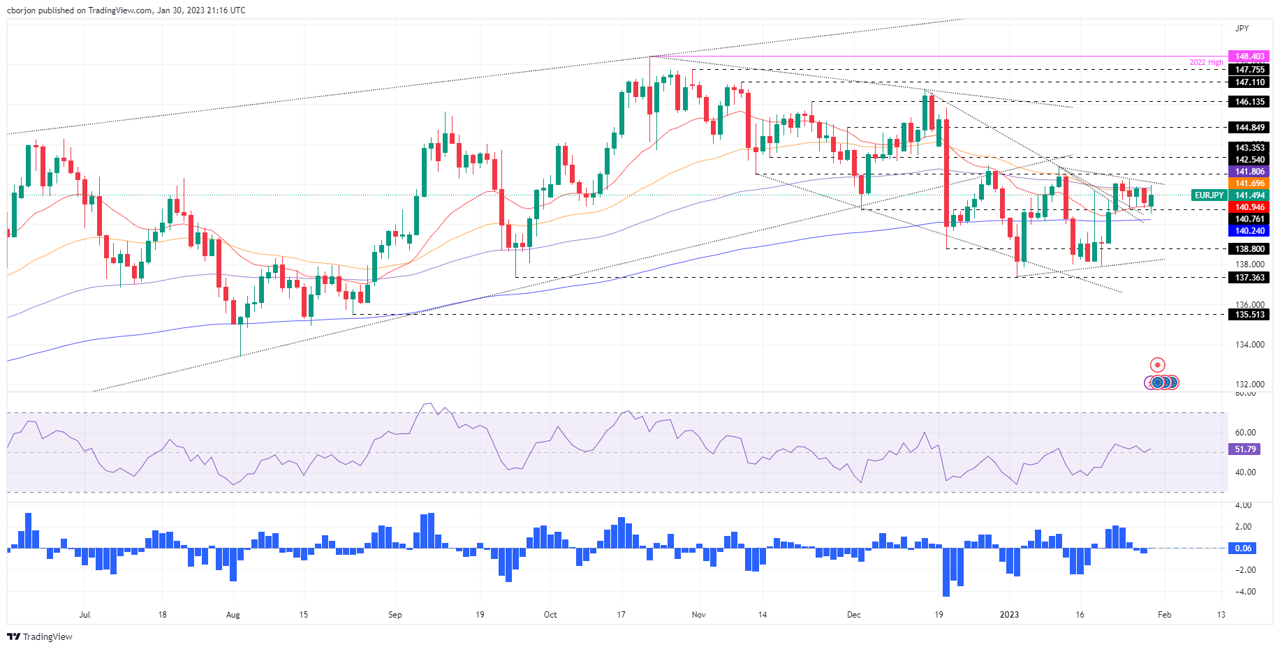 欧元/日元价格分析:盘整于20日/50日指数均线构成的区间,处在141.50附近