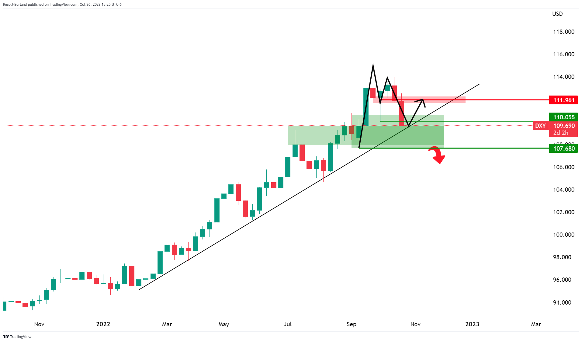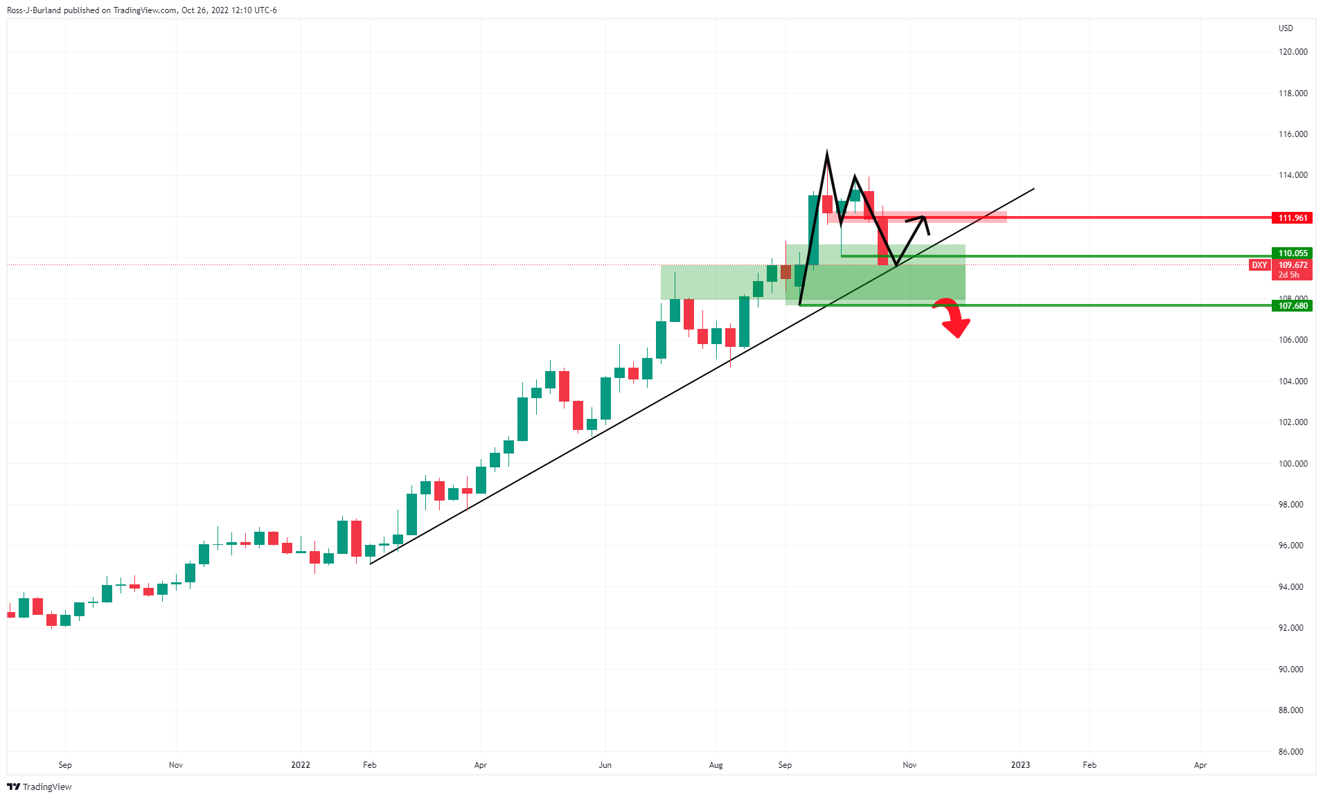 加央行政策支持下,美元/加元飙升,随后空头介入,但由于继加央行加息后释放欠鸽派倾向,加元/美元自见顶形态反转开始走强。 以下美元指数图表显示,美元现在处于十字路口,但如果多头守住趋势线正面,那么预计