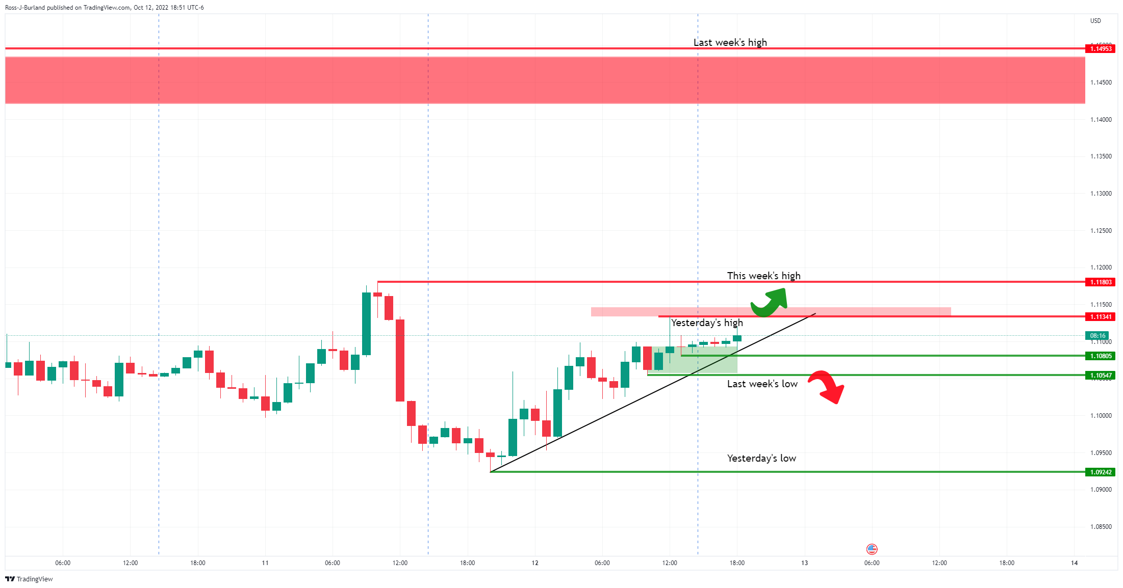 亚市,英镑正处于反弹当中,突破上周低点1.1055,目前正挑战1.1100(亚市高开的水平)。下图显示英镑/美元有望重测周三高点的前景,以及英镑/美元将突破1.1150,然后是前日高位1.1180。