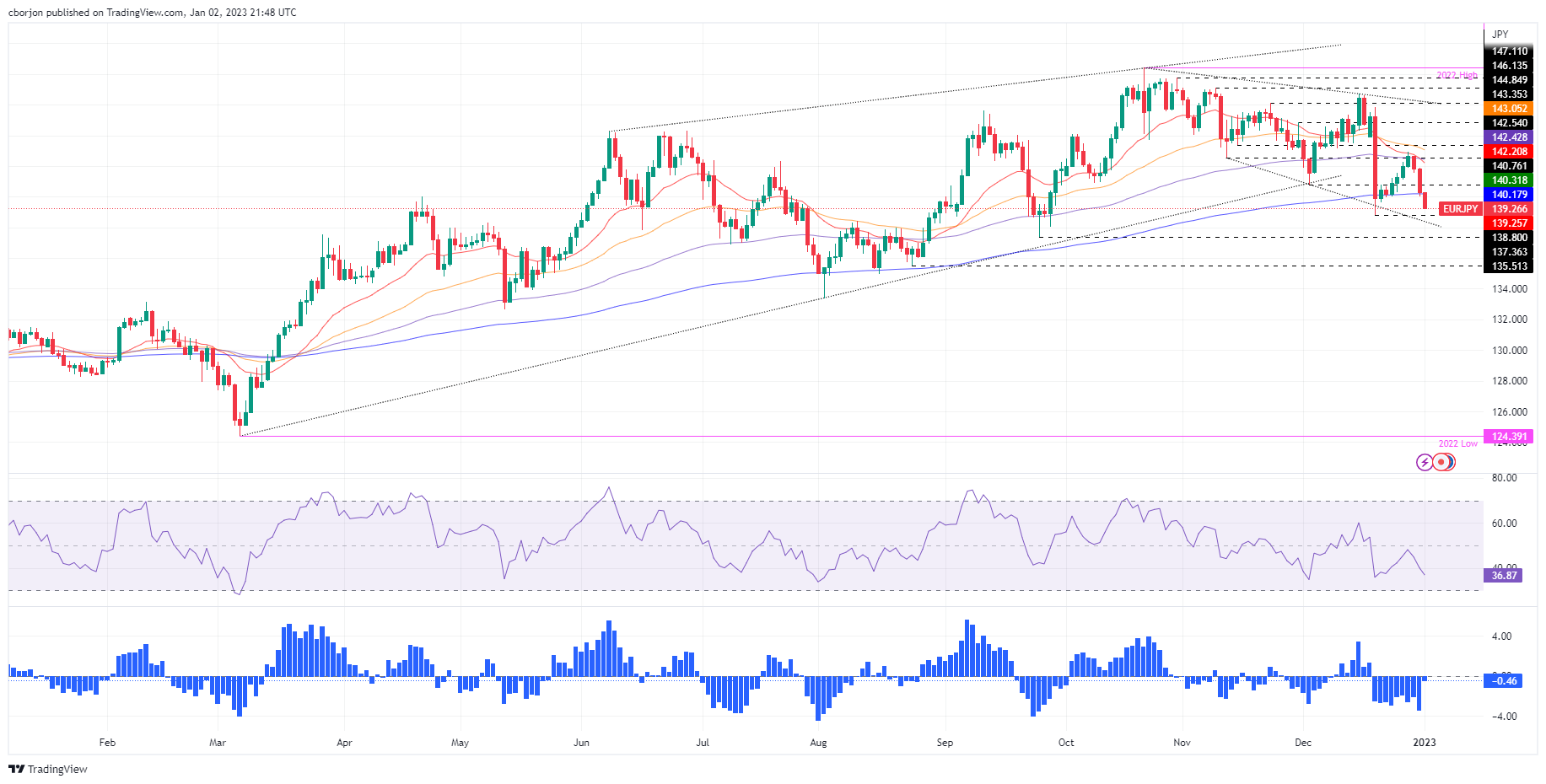 欧元/日元跌破200日均线140.18,连续三个交易日下跌,自上周142.93的高点以来下跌2.40%。因此,欧元/日元继触及日线高位140.31日后,交易于139.26,处在开盘水平紧下方。 欧元