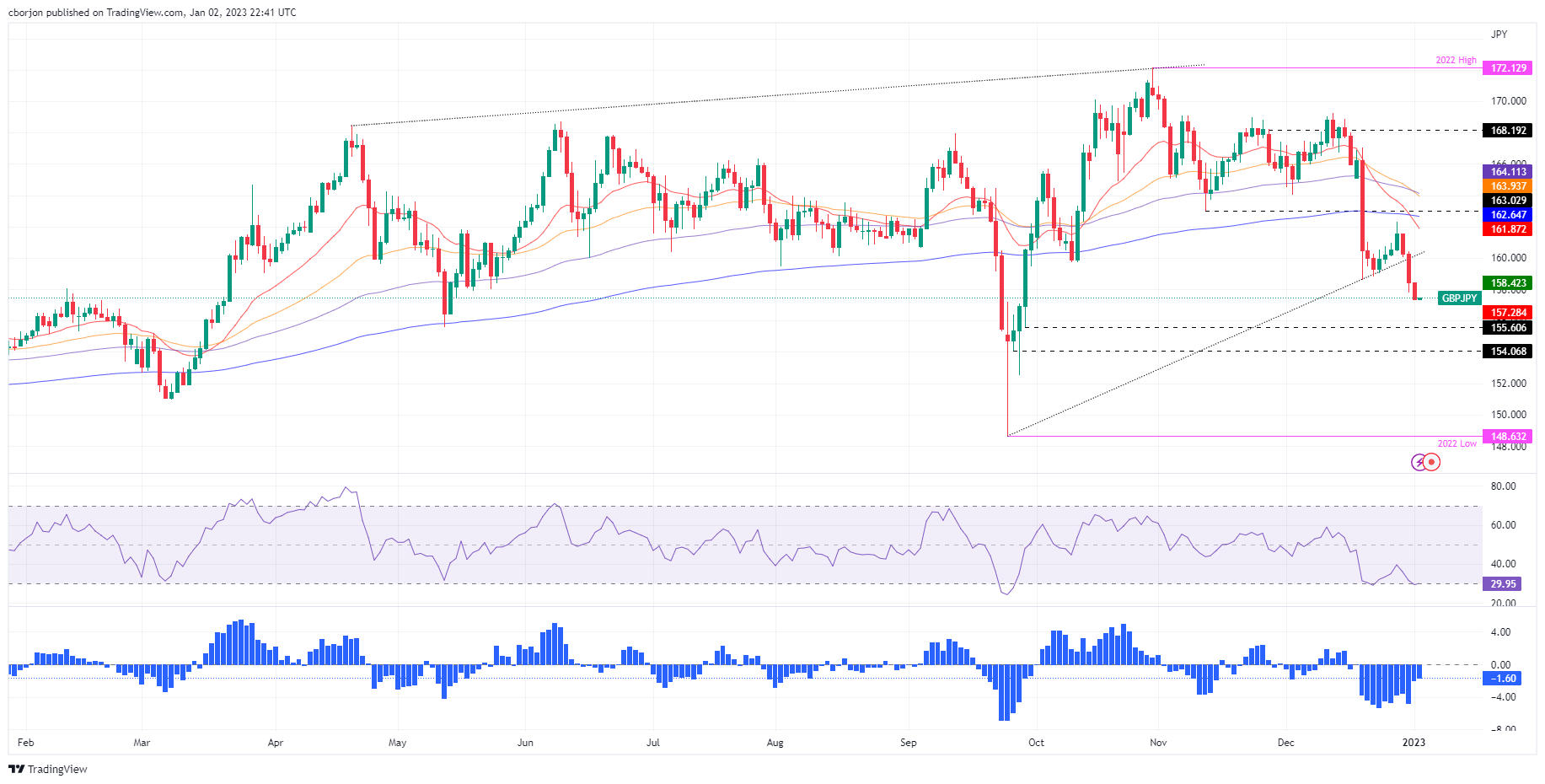 英镑/日元周一暴跌愈100个点,延续下跌三日,英镑/日元跌破200日指数移动均线(EMA)。此外,20日均线向下穿越200日均线下方加速下跌趋势,英镑/日元有望测试155.00关口。发稿时英镑/日元交