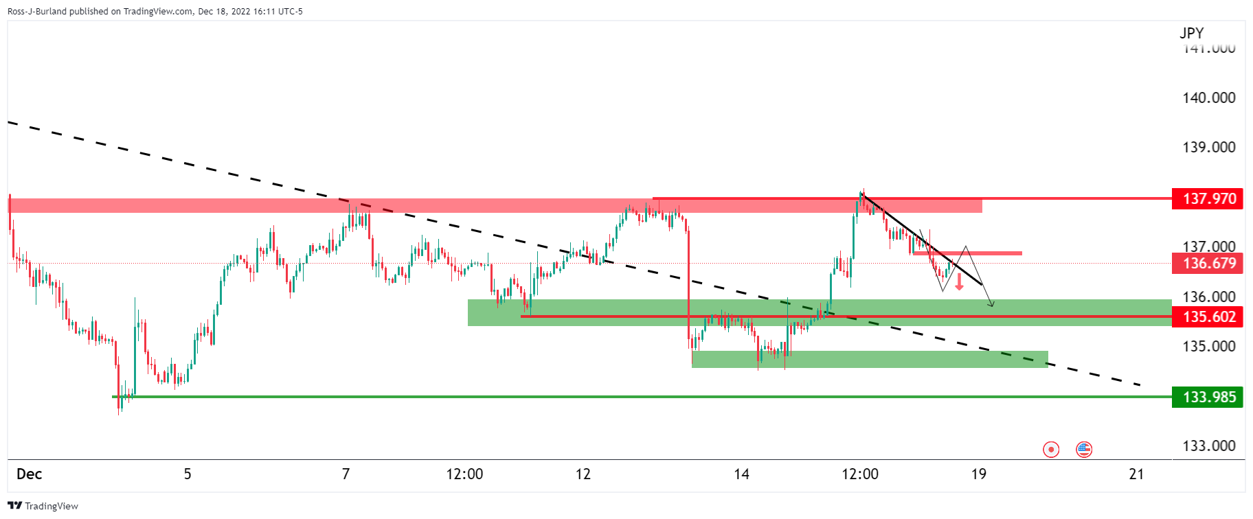 根据开盘前的分析,日本央行明年将在新的央行行长的领导下调整其超宽松的货币政策,这给了日元一个提振: 美元/日元前期分析 美元/日元最新波动 美元/日元遇阻趋势线,正走出低位135.85,