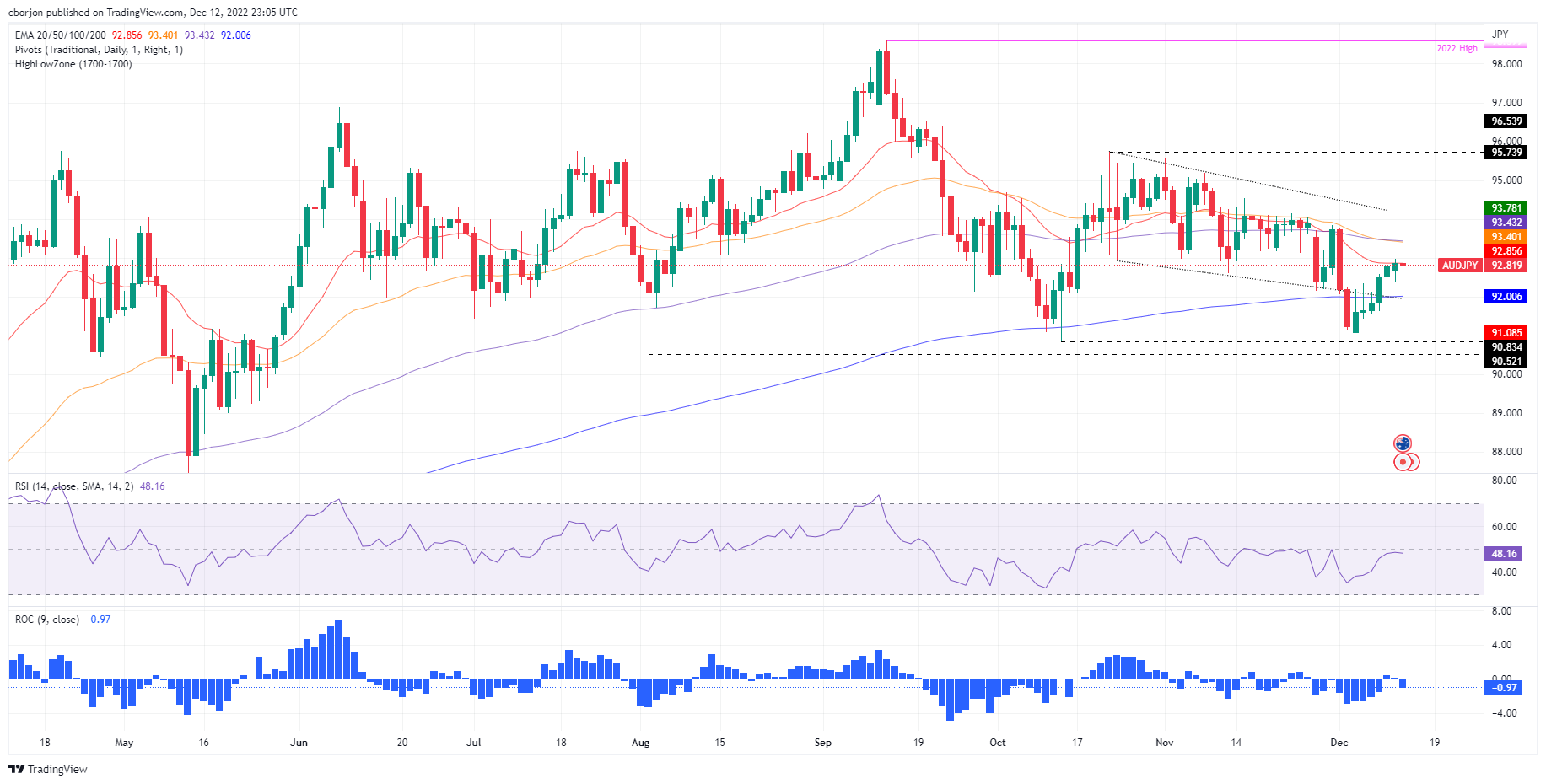 澳元/日元连续7天延续上涨势头,高风险货币受益,而避险货币仍面临下行压力,受即将出炉的美国通胀数据提振,美元除外。发稿时,澳元/日元交投于92.81。 澳元/日元价格分析:技术展望 日图显示,澳元/