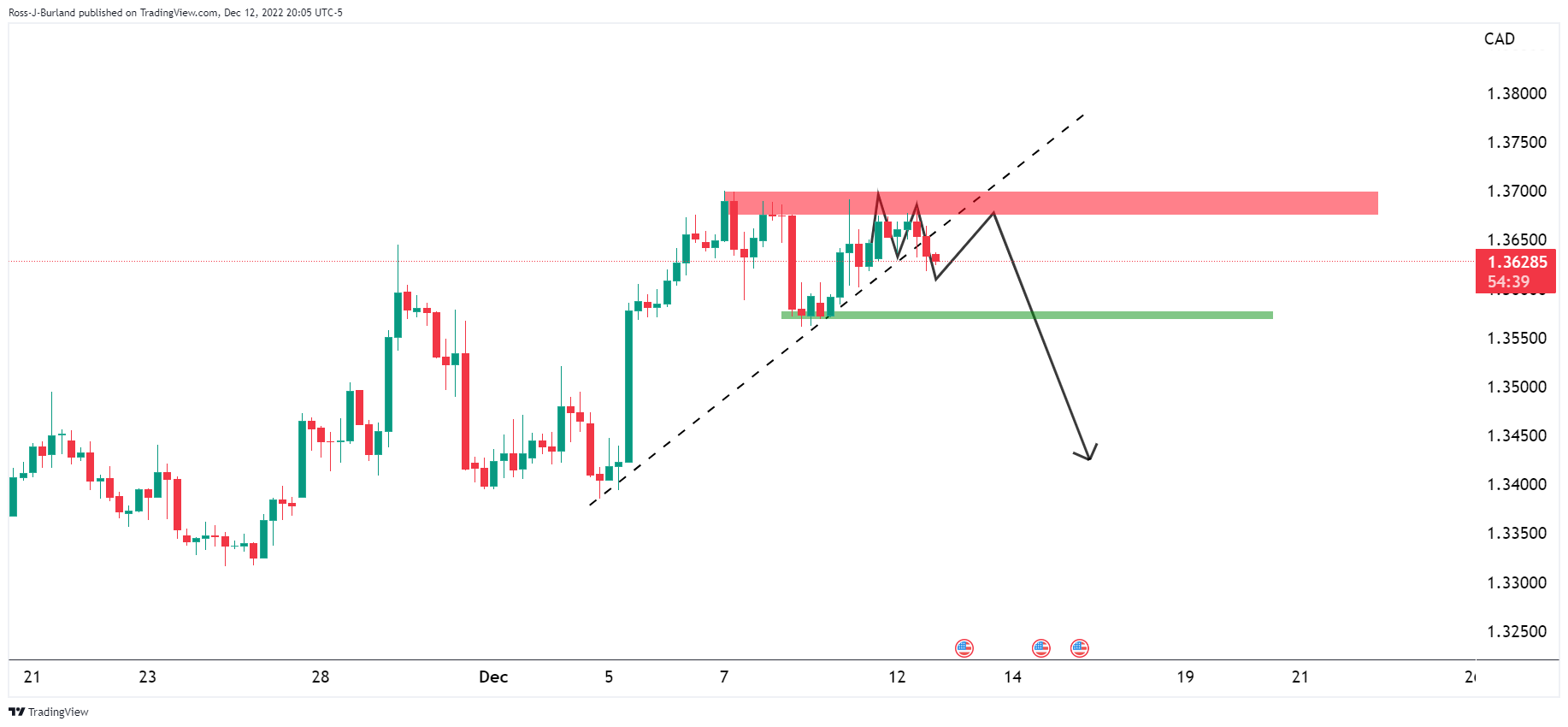 如以下技术分析所示,美元/加元空头正走强,汇价正测试1.3620水平。随着美元/加元跌至4小时图看涨趋势的背面,空头正介入。 美元/加元4小时图 头寸分配阶段可能正起作用,美元/加元有可能再次