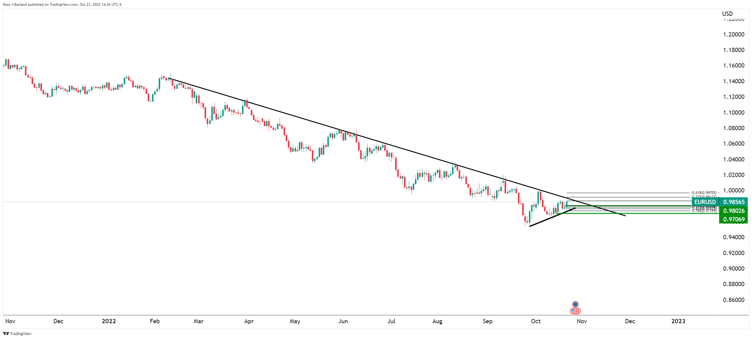 上周五汇市大幅波动引发欧元买盘。美元指数下跌,原因是投资者对激进货币紧缩的押注有所回落。此前《华尔街日报》发表一篇报道称,一些美联储官员担心大幅加息会导致过度紧缩。继经历上周五波动之后,欧元已经脱离中