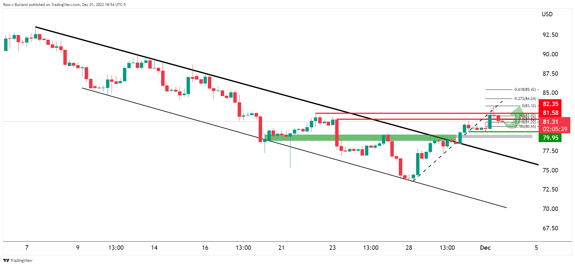 按照前期分析,到目前为止,继跌破主要的看跌通道后,WTI油价12月维持处在头寸分配阶段,如下分析将说明: WTI油价前期分析 在上述日图显示,WTI油价正接近前期高位,正在如图所示的头寸分