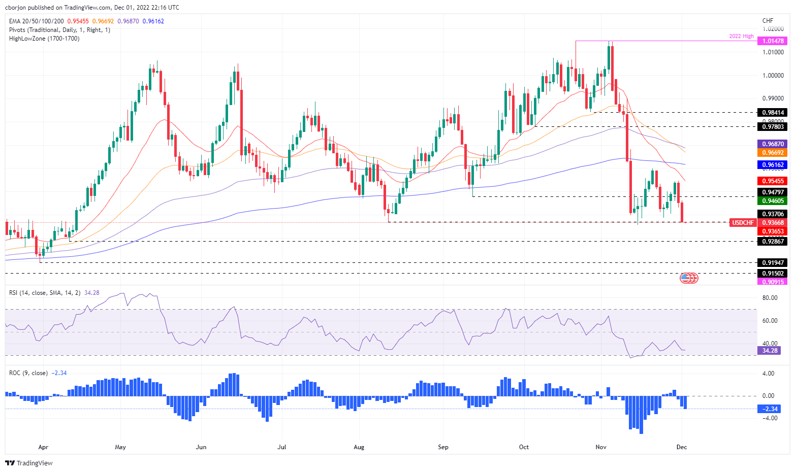 美国制造业活动出现收缩,同时美联储收紧货币政策,美国经济前景黯淡,美元/瑞郎连续两天扩大跌幅。因此,美元(USD)走弱,与瑞郎(CHF)方向相反。发稿时,美元/瑞郎交投于0.9366,较开盘水平下跌0