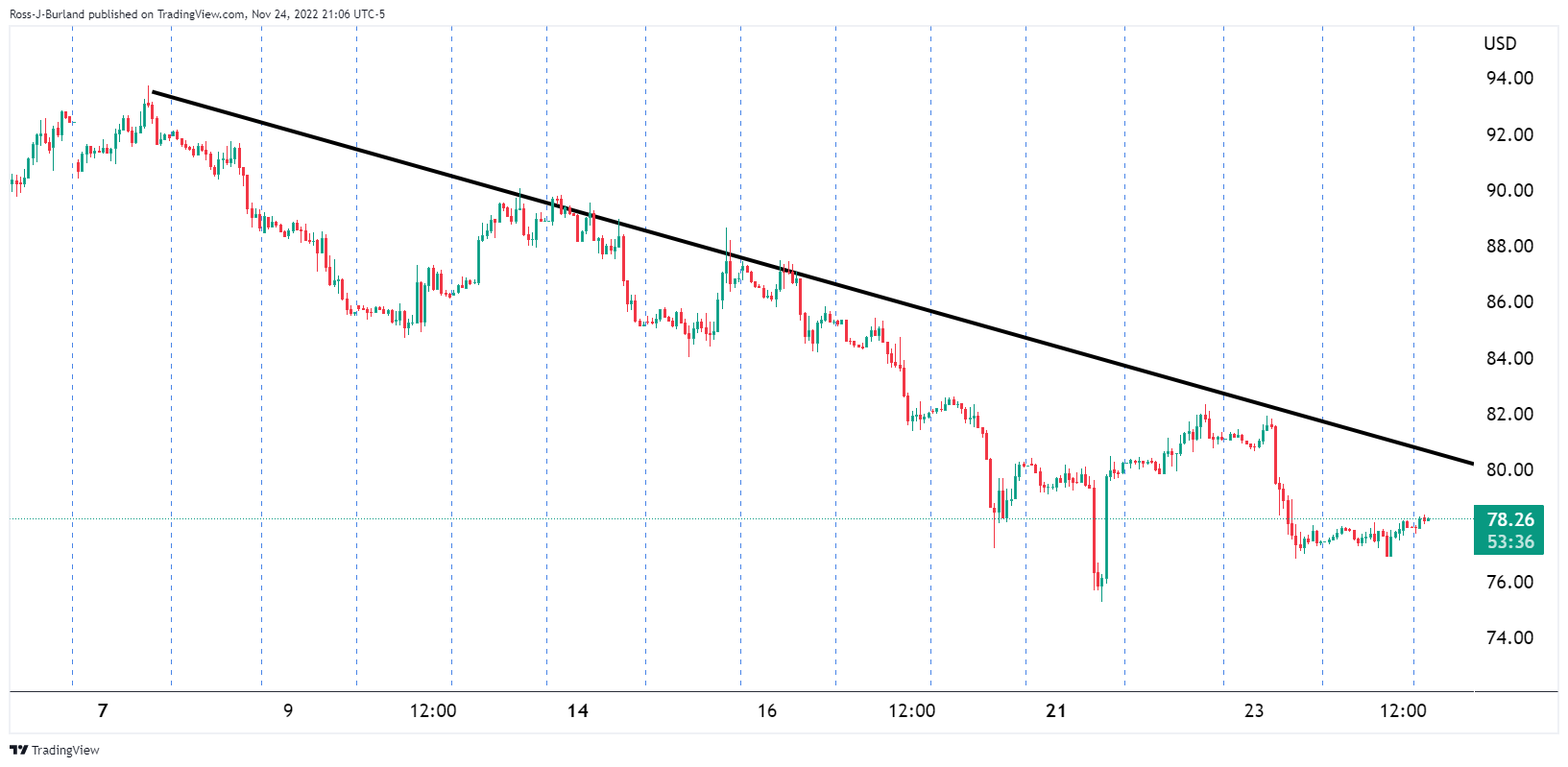 中国周四(11月24日)新增新冠病毒病例创下纪录。中国各地多个城市实行局部封控,这使中国这一全球第二大经济体的前景变得黯淡。 同时,券商野村证券将中国第四季度国内生产总值息率预测从2.8%下调至2.