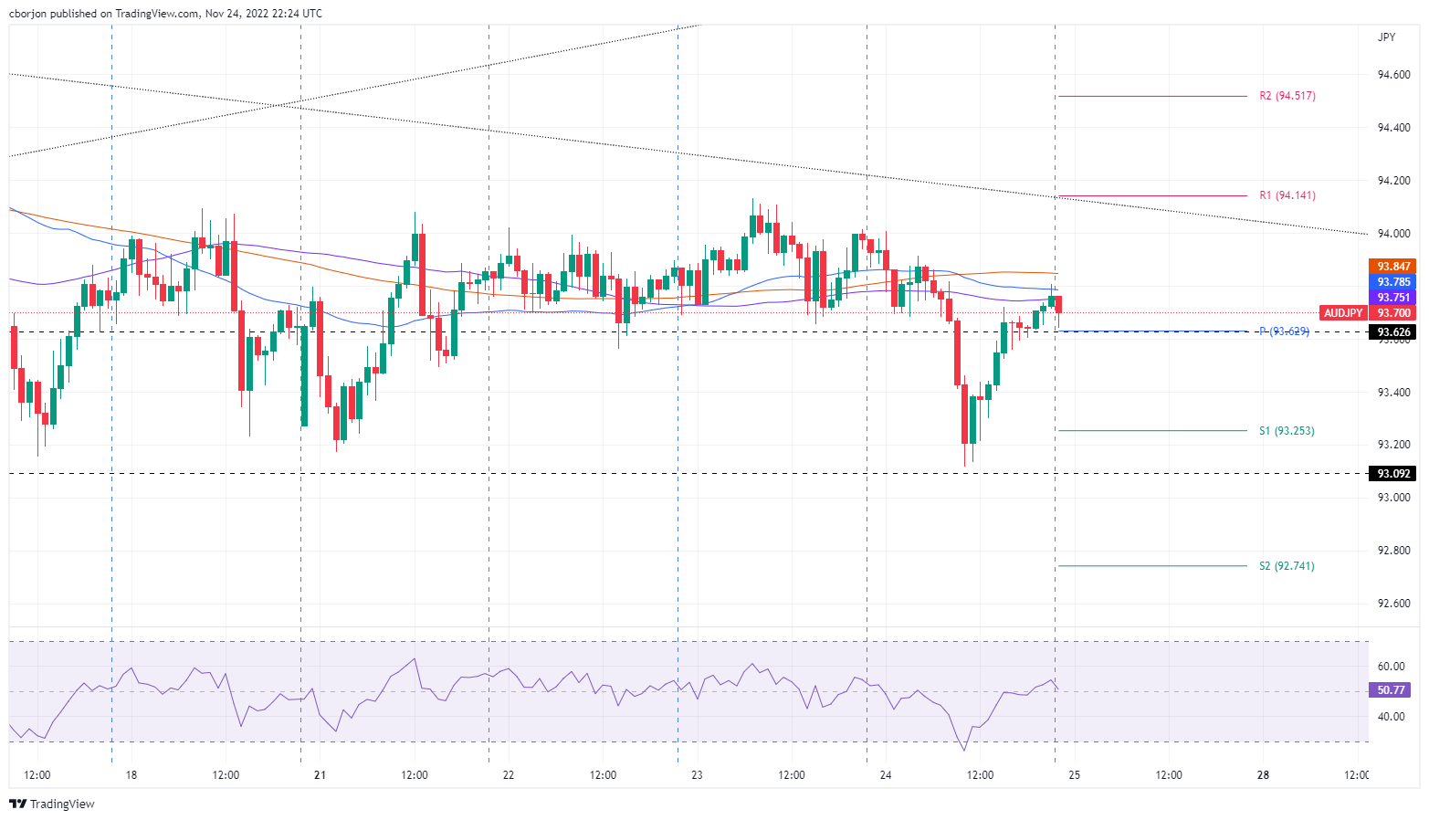 市场情绪乐观,澳元/日元大幅下跌。 由于缺乏催化剂且澳元/美元受困于93.00-94.00区间,澳元/美元维持盘整。 澳元/日元价格分析:相对强弱指标转为看跌,可能会跌至93.00。 周四全天澳元/日