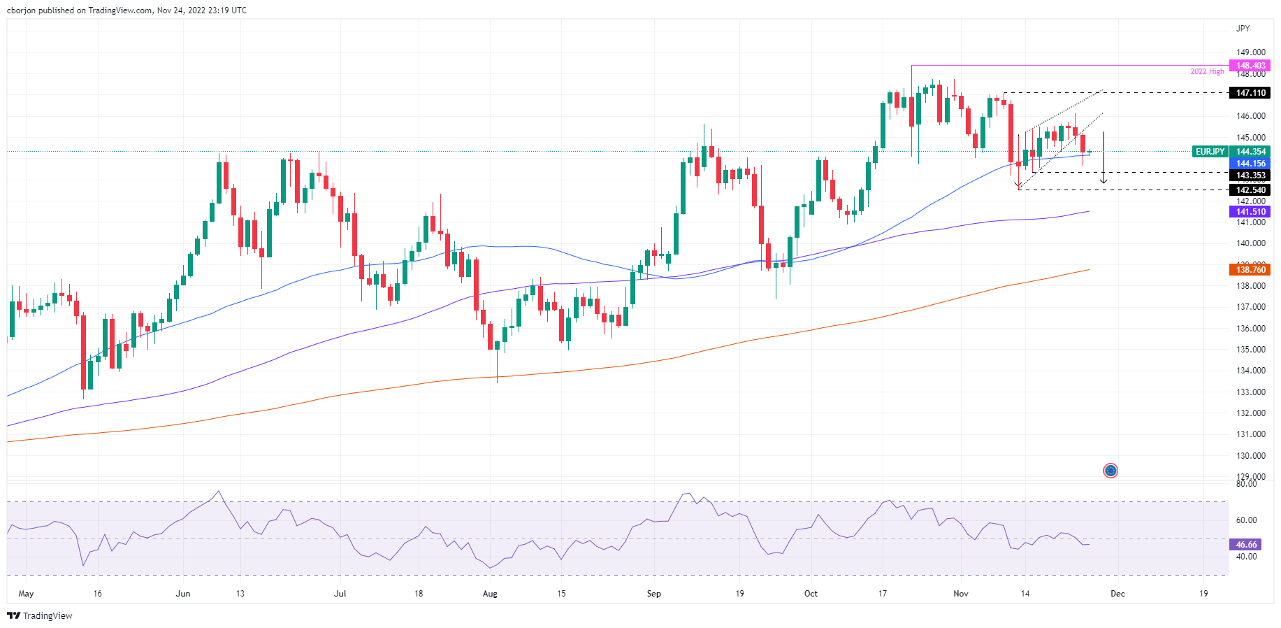 欧元/日元价格分析:跌破上升楔形,指向142.50水平