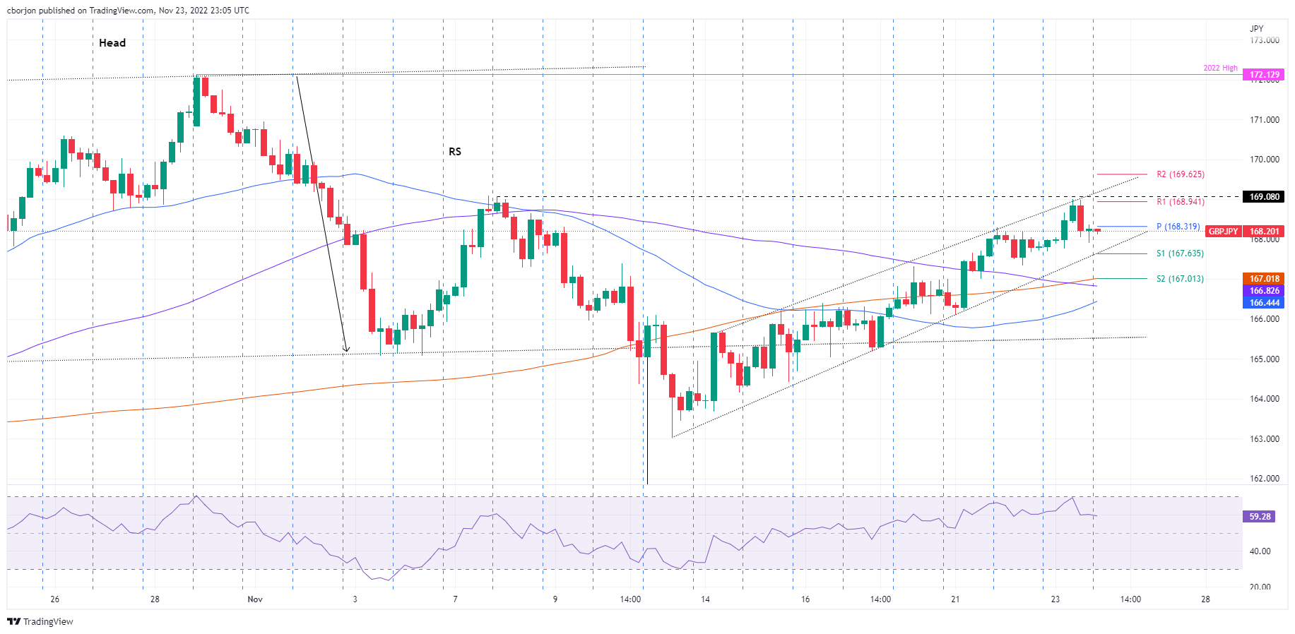 英镑/日元攀升并测试头肩形态右肩,但继卖家在169.00关口下方介入后出现回调,加大跌至168.10区域的前景。英镑/日元交投于168.16,亚市微幅丅0.04%。 英镑/日元价格分析:技术前景