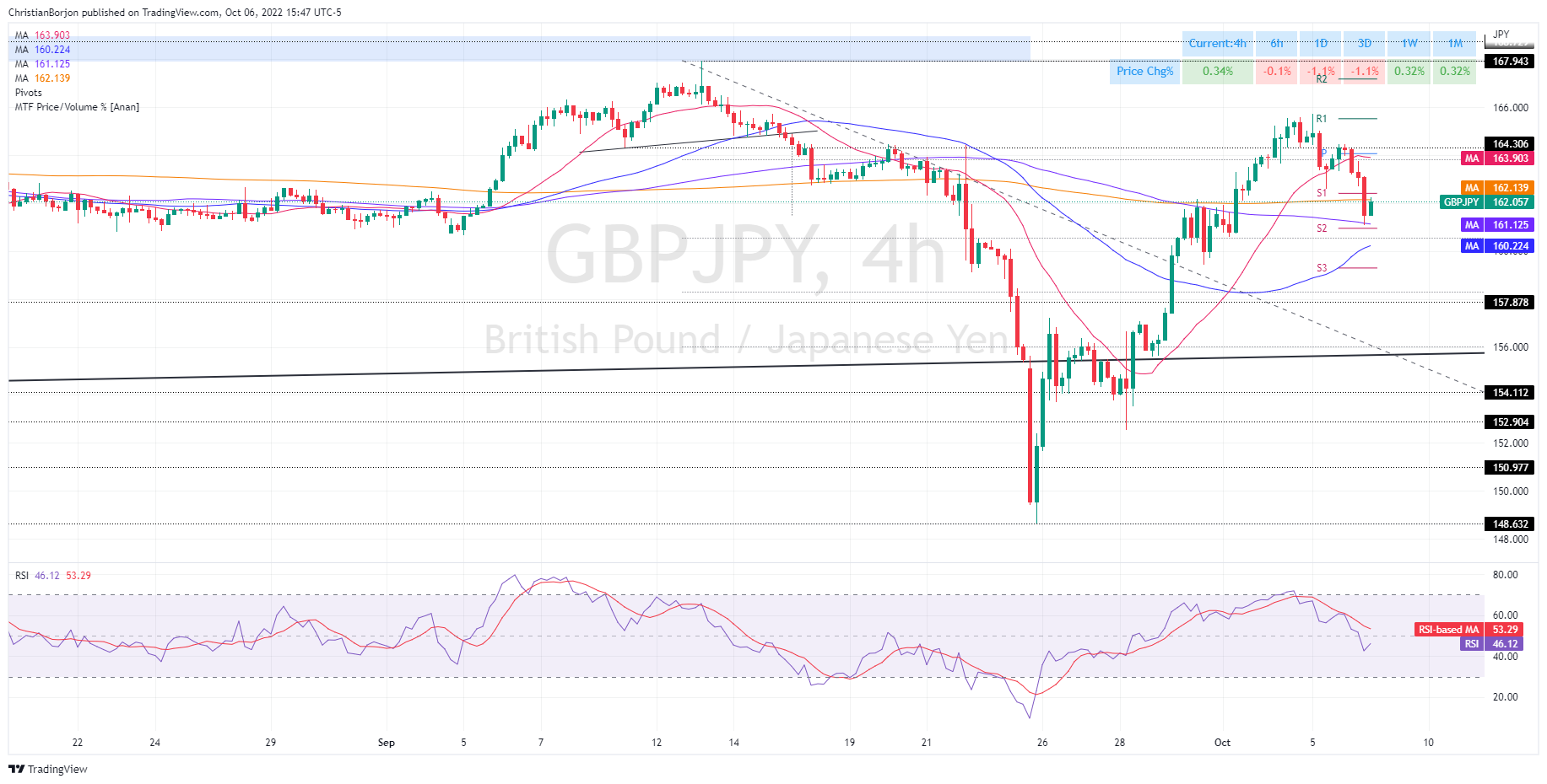 尽管过去几天出现下跌,但英镑/日元本周仍保持积极,上涨了0.32%。 英镑/日元若遇阻4小时图200-均线,将大幅跌至160.00水平。 英镑/日元扩大跌势,因市场担心美联储可能会采取