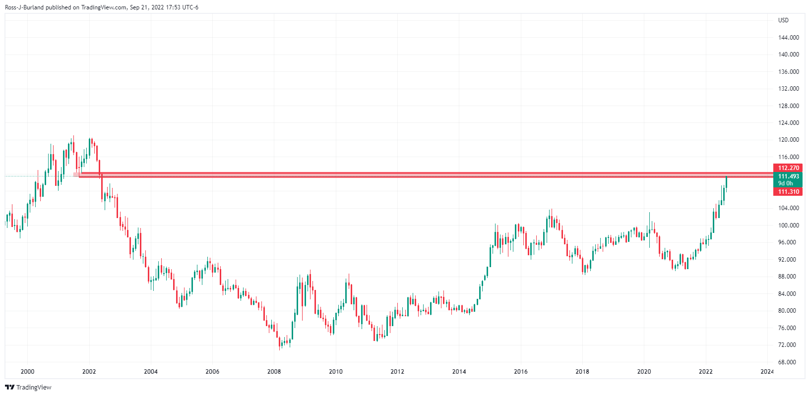 周三继美联储再次加息 75 个基点并暗示在即将召开的会议上将更大幅度加息后,美元飙升至 20 年来的新高,英镑/美元下跌。这已将英镑推向长线周期维持看跌前景,如下图所示: 英镑/美元日线图、月线图、