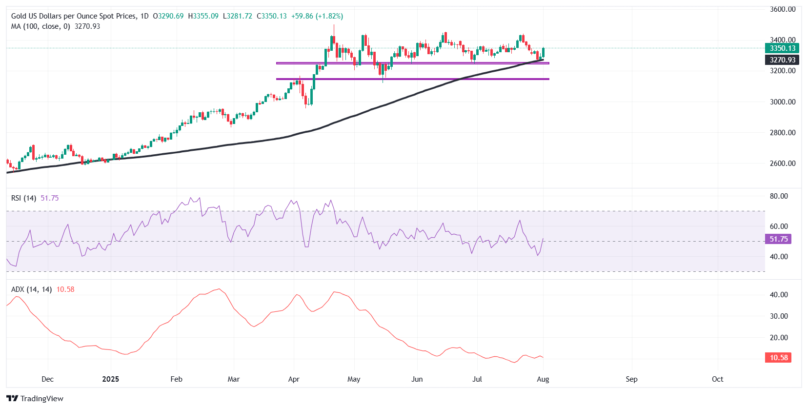 黄金(XAU/USD)在周五因美国非农就业(NFP)报告不及预期而飙升至3350美元,触发了广泛的美元抛售,并恢复了市场对美联储(Fed)在9月降息的预期。在欧洲交易时段,黄金在3300美元附近平稳交