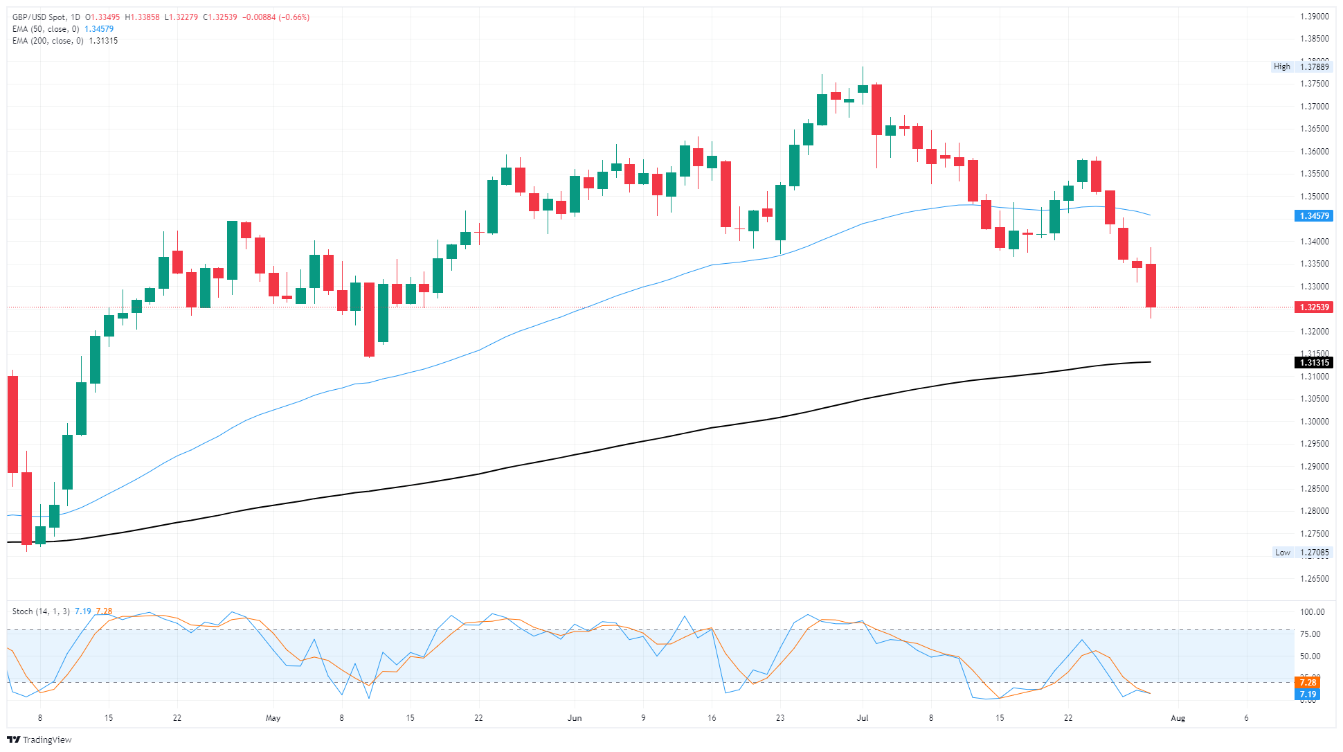 周三,英镑/美元连续第五个交易日下跌,因美国联邦储备委员会(美联储)维持利率不变并坚持其顽固的观望态度,削弱了市场对9月份降息的预期,导致美元(USD)获得广泛市场买盘。
