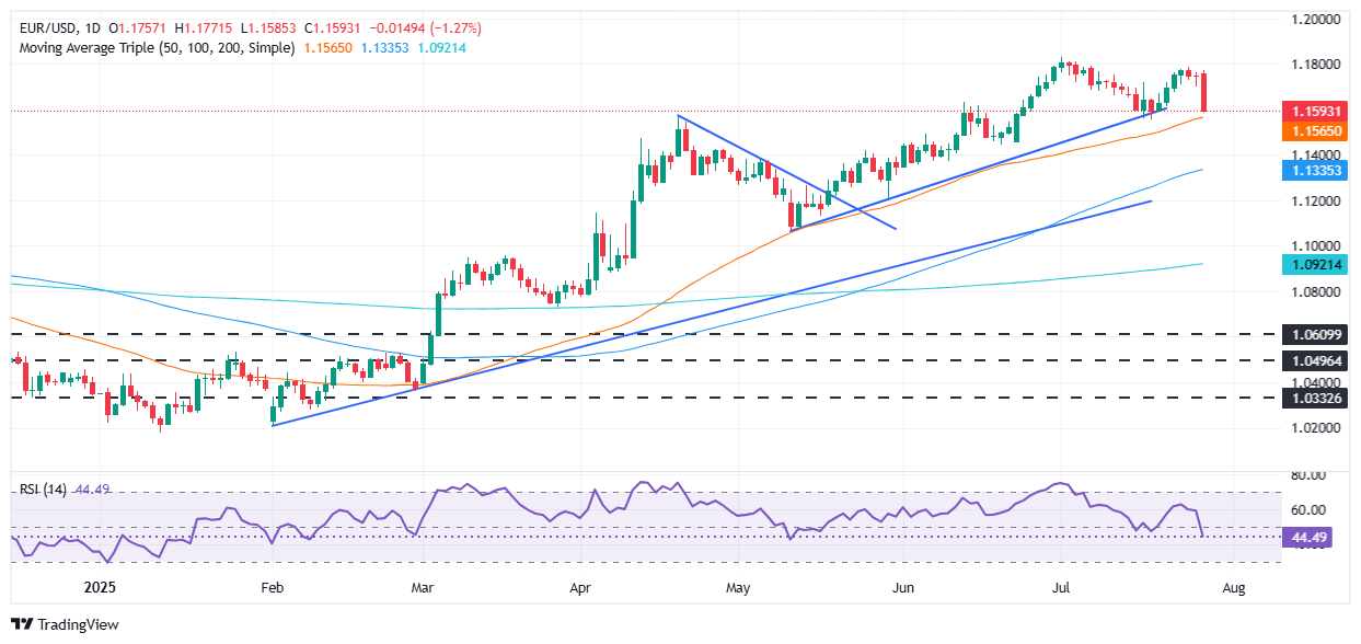 欧元/美元周一下跌超过 1%,因投资者在美国(US)和欧盟(EU)达成类似于日本签署的贸易协议的消息中买入美元。该货币对在触及 1.1771 的高点后,目前交投于 1.1590。