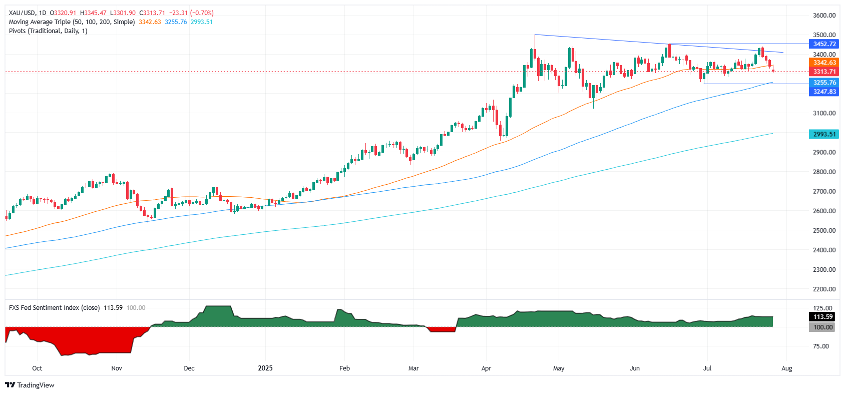 金价连续第四个交易日延续跌势,下跌超过0.60%,因为欧盟(EU)和美国(US)在周末达成了一项贸易协议,将对欧盟商品的关税从提议的30%降低至15%