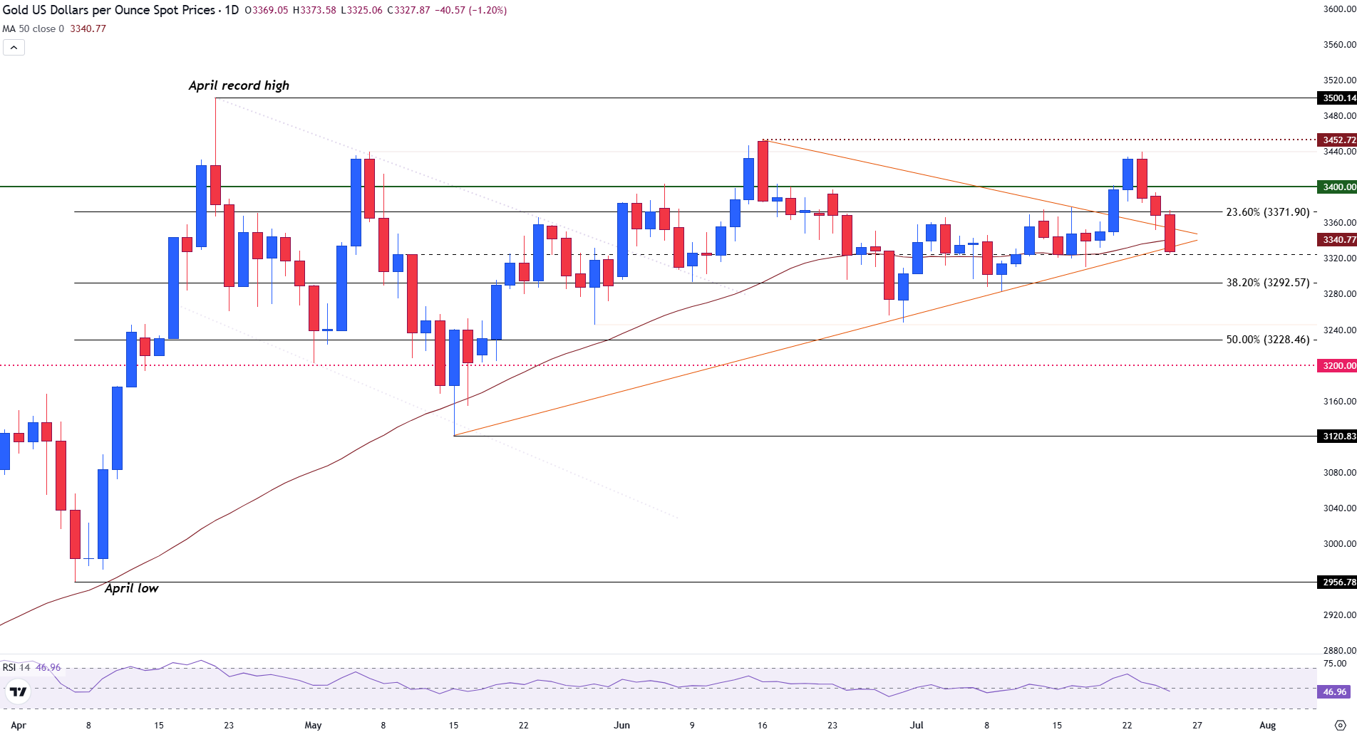 黄金在周五交易走低,因风险偏好改善、贸易紧张局势缓解以及美元走强。截至发稿时,黄金/美元(XAU/USD)交投于3300美元以下,日内下跌超过1%,受到美债收益率上升和避险资产需求减弱的压力。