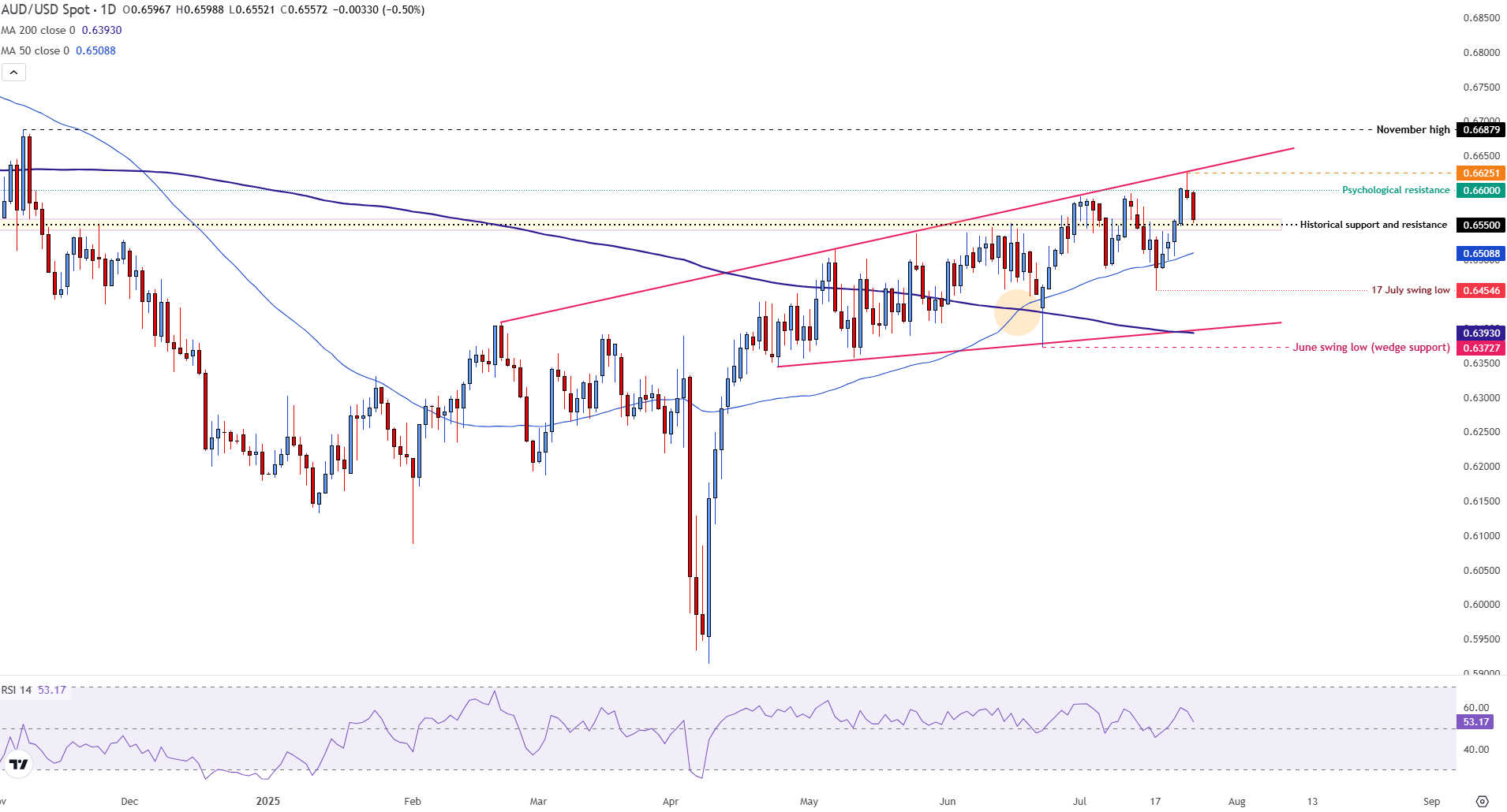 澳元/美元从年内高点回落,强势美元和楔形形态拒绝对前景施加压力