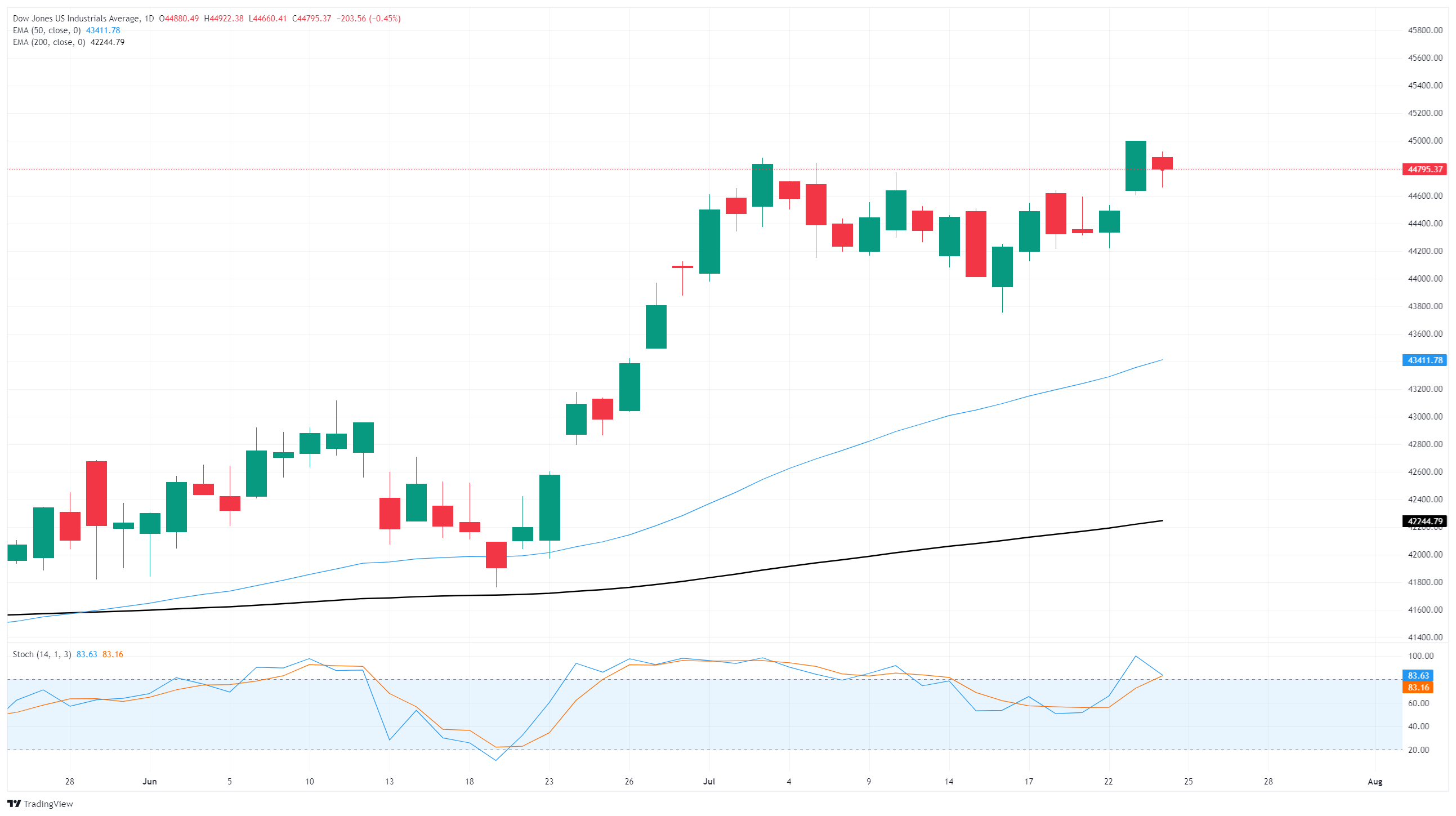 道琼斯工业平均指数(DJIA)在周四出现下跌,盘整于45,000关口下方,因为财报失误拖累了道琼斯上市的关键超配股票