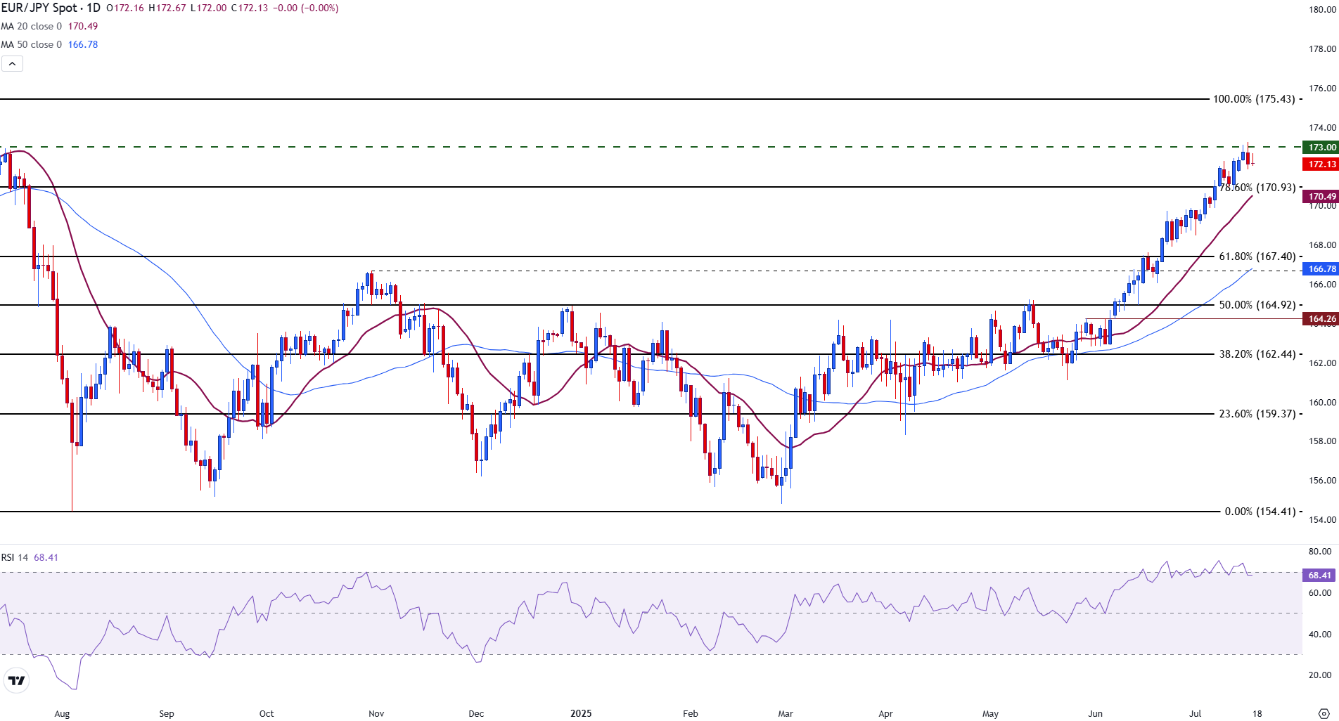 周四,欧元(EUR)对日元(JPY)在窄幅区间内交易,此前周三达到173.25的一年高点。尽管出现小幅回调,但中央银行的分歧和日本经济前景的减弱仍然是一个关键主题。