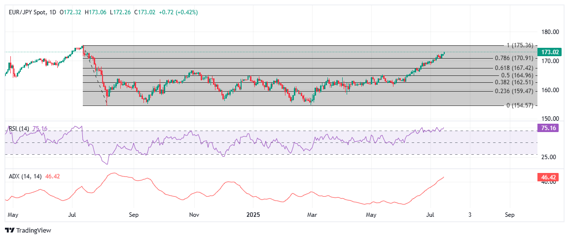 欧元在周二对日元的涨势连续第三个交易日延续,欧元/日元在美盘期间攀升至173.00水平——这是自2024年7月12日以来的水平。