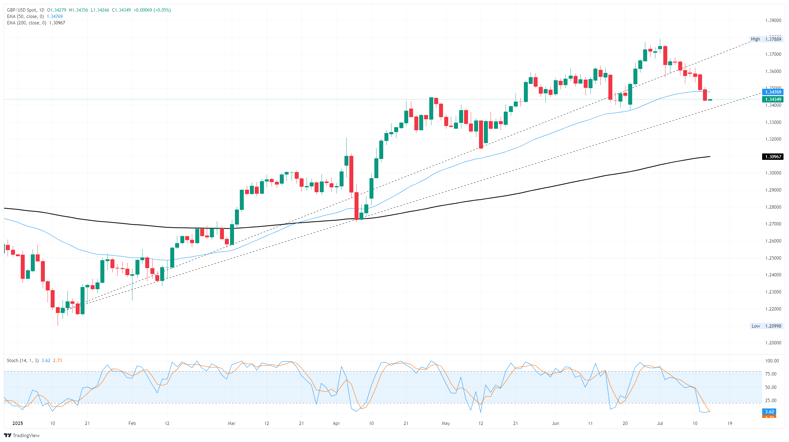 英镑/美元周一进一步下跌,连续第七个交易日收低,并首次跌回50日指数移动均线(EMA)以下,自4月中旬以来首次。