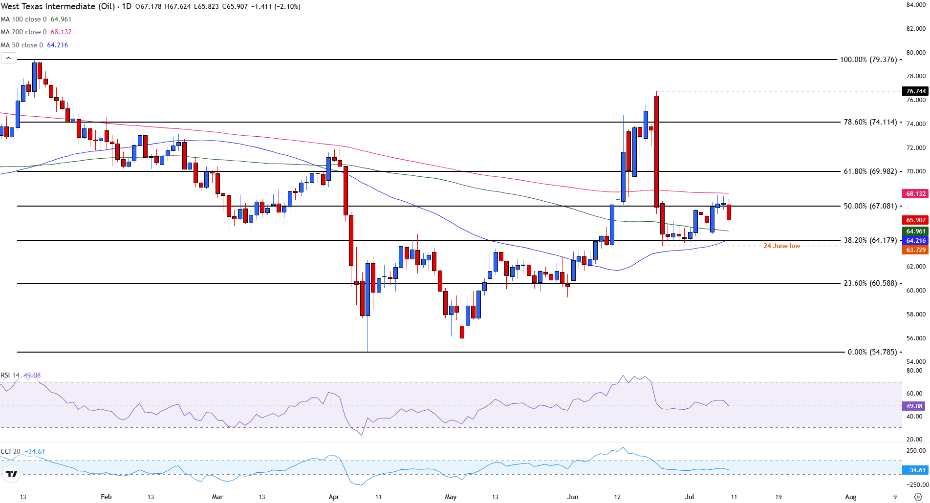 周四,西德克萨斯中质原油(WTI)价格下跌,回落至67.00美元以下,市场对供应担忧加剧和需求预期减弱作出反应