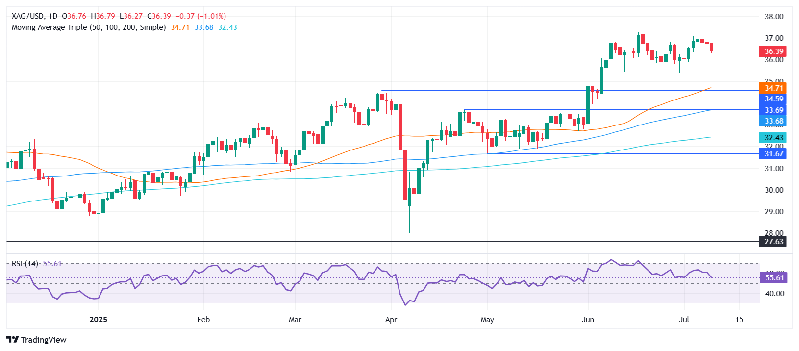 白银在美联储会议纪要发布后,靠近20日简单移动平均线进行整理