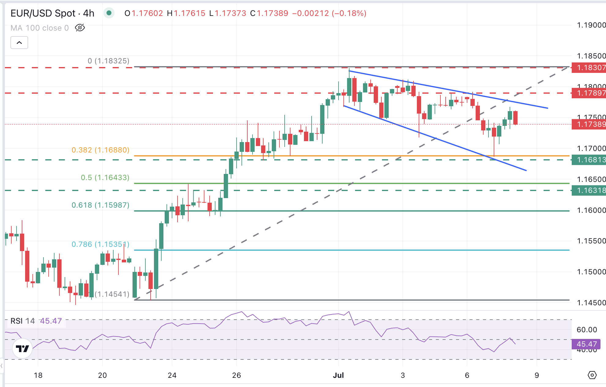 欧元/美元货币对正在从日内高点回落,并保持上周高点的整体看跌趋势不变