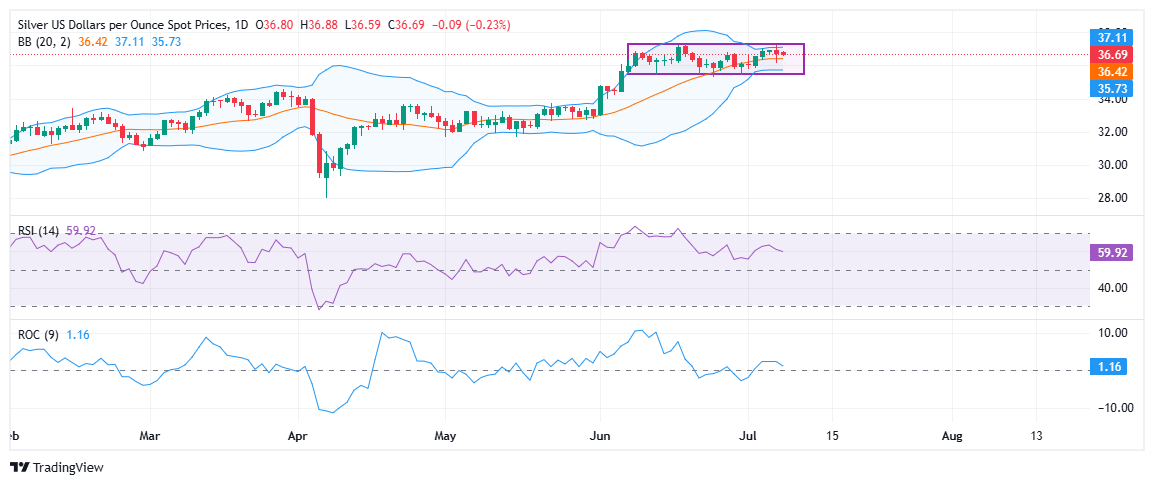 周二,银价(白银/美元)在36.70美元附近交易,日内略有回落,但在窄幅盘整区间内保持坚挺。由于市场评估美国总统唐纳德·特朗普最新关税威胁的潜在影响,该金属一直徘徊在13年高点附近。