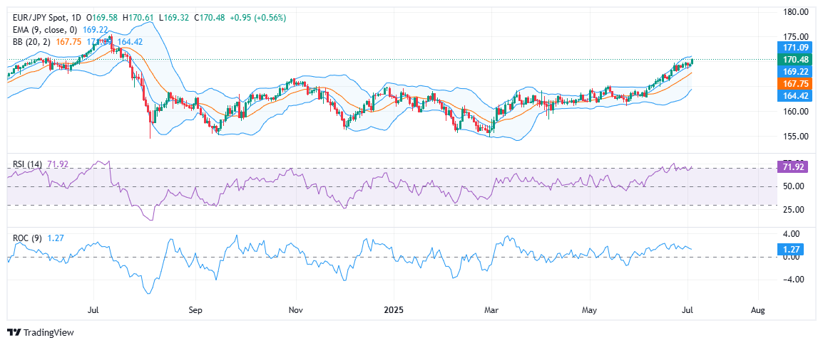 欧元(EUR)在周四对日元(JPY)表现坚挺,欧元/日元交叉盘在美国非农就业数据(NFP)向好的推动下,攀升至自2024年7月以来的最高水平。此时此刻,该货币对小幅走高,在美国交易时段交易于170.4