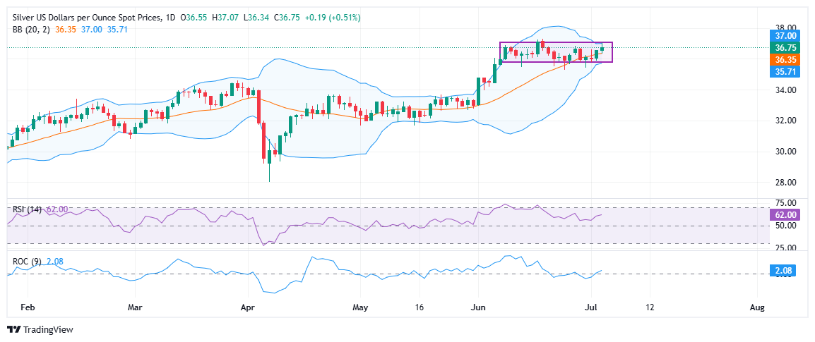 银价(XAG/USD)在周四以适度的看涨偏向交易,在美国交易时段稳定于 36.75 美元附近,此前从盘中高点 37.07 美元回落。