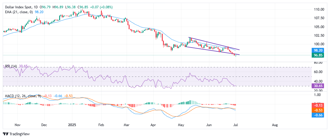 美元(USD)继续面临卖压,美元指数(DXY)在周二早盘跌至96.38,创下自2022年2月以来的最低水平