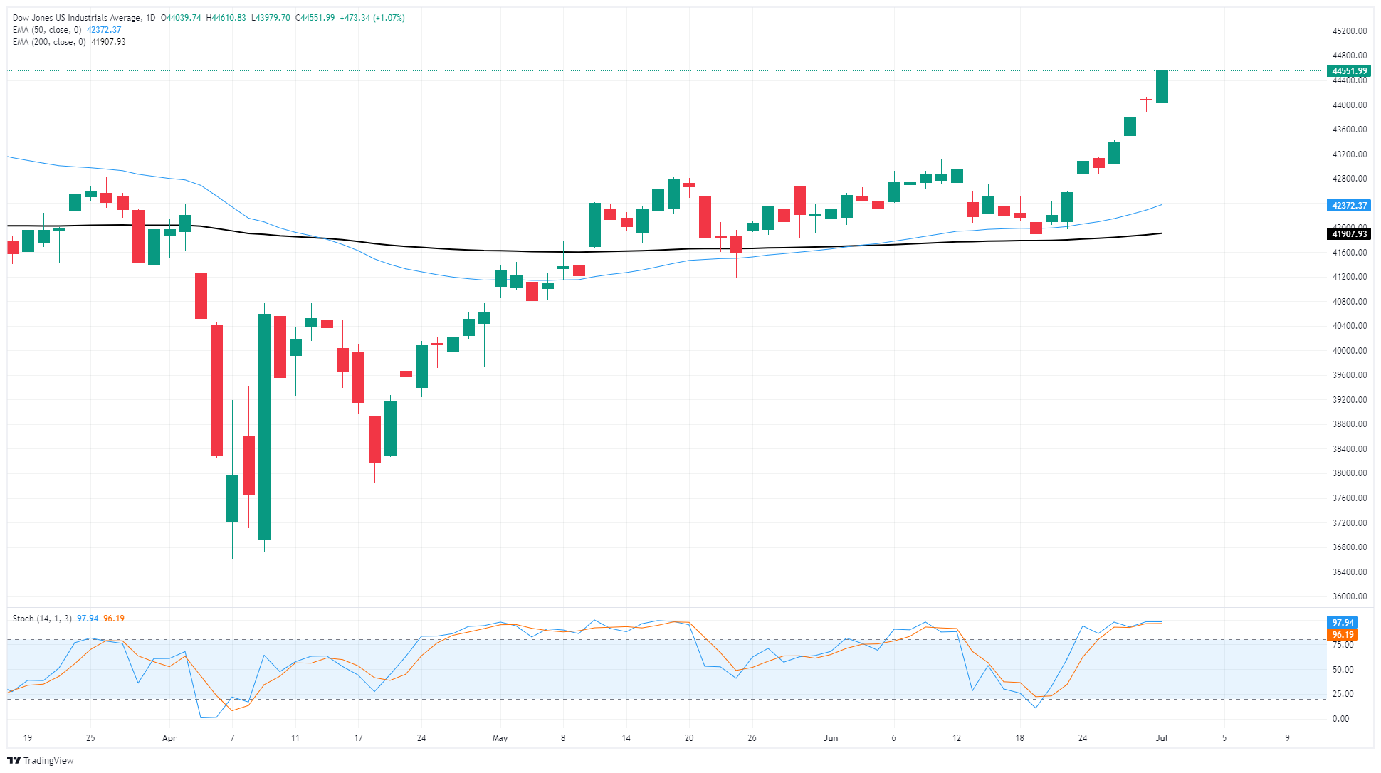 道琼斯工业平均指数(DJIA)周二上涨至约五个月来的最高水平,首次突破44,500点,自2月初以来首次测试该水平。股市整体表现参差不齐,科技股的下跌使其他主要指数受到压制