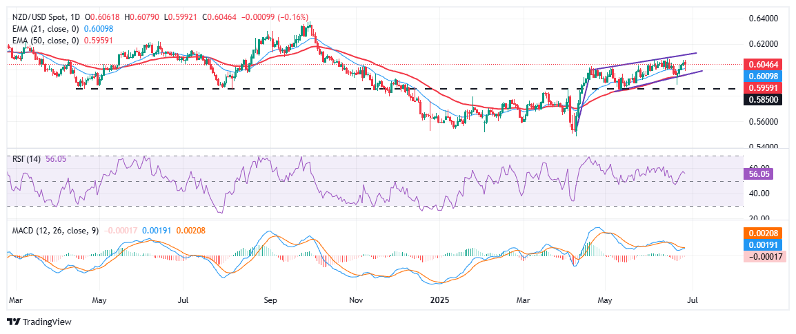 纽元/美元周五难以延续近期的上涨,徘徊在0.6045附近,盘中最高触及0.6079。该货币对仍被困在一个上升楔形形态中,这通常是看跌信号,而整体疲软的美元则保持稳定