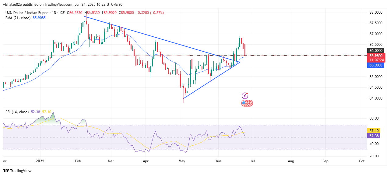美元/印度卢比因伊朗-以色列停火缓解和油价走软而下跌