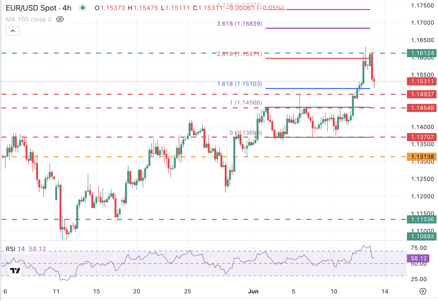 欧元/美元在周五结束了为期四天的反弹,从接近四年高点1.1600回落至目前略低于1.1500的水平。