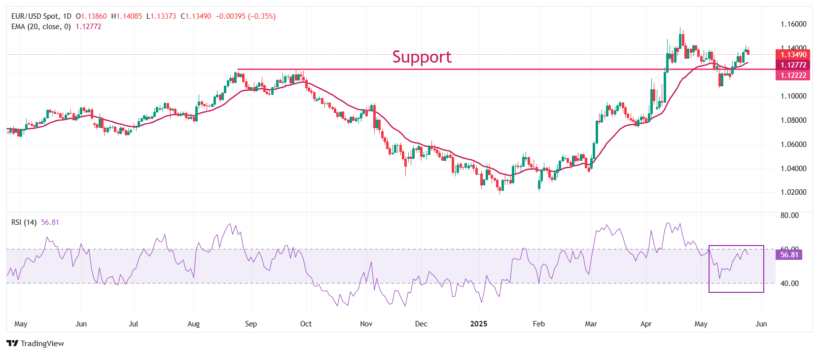 周二北美交易时段,欧元/美元在从前一天创下的月高点 1.1425 回调后,交易价格接近 1.1350。