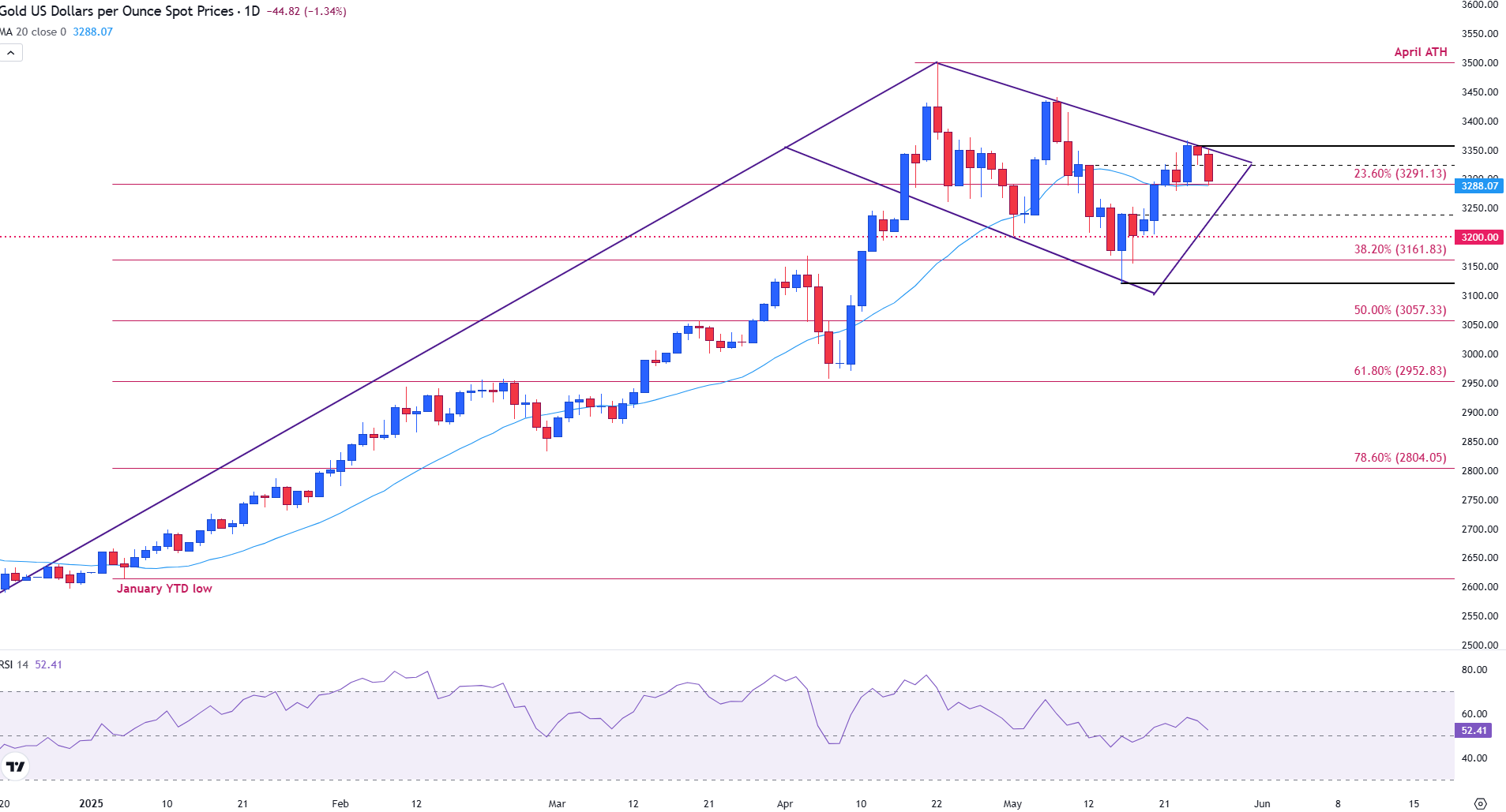 周二,黄金继续在一个逐渐收窄的盘整区间内交易,此前在今年早些时候创下了历史新高。在 4 月份达到历史最高点后,市场已转入一种以下降楔形形态为特征的持平模式,反映出动能的收紧。