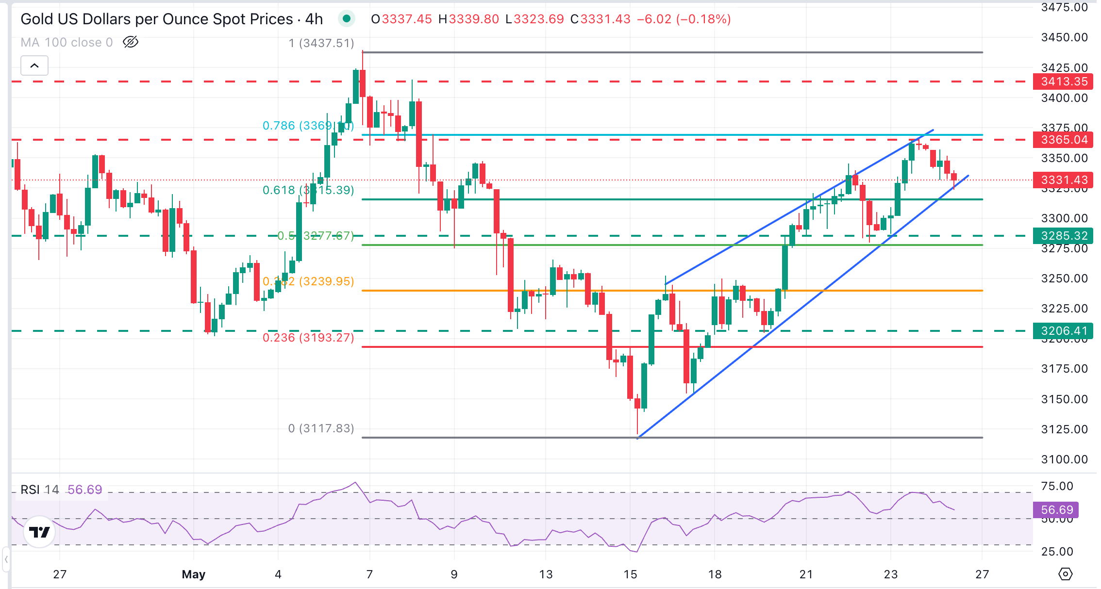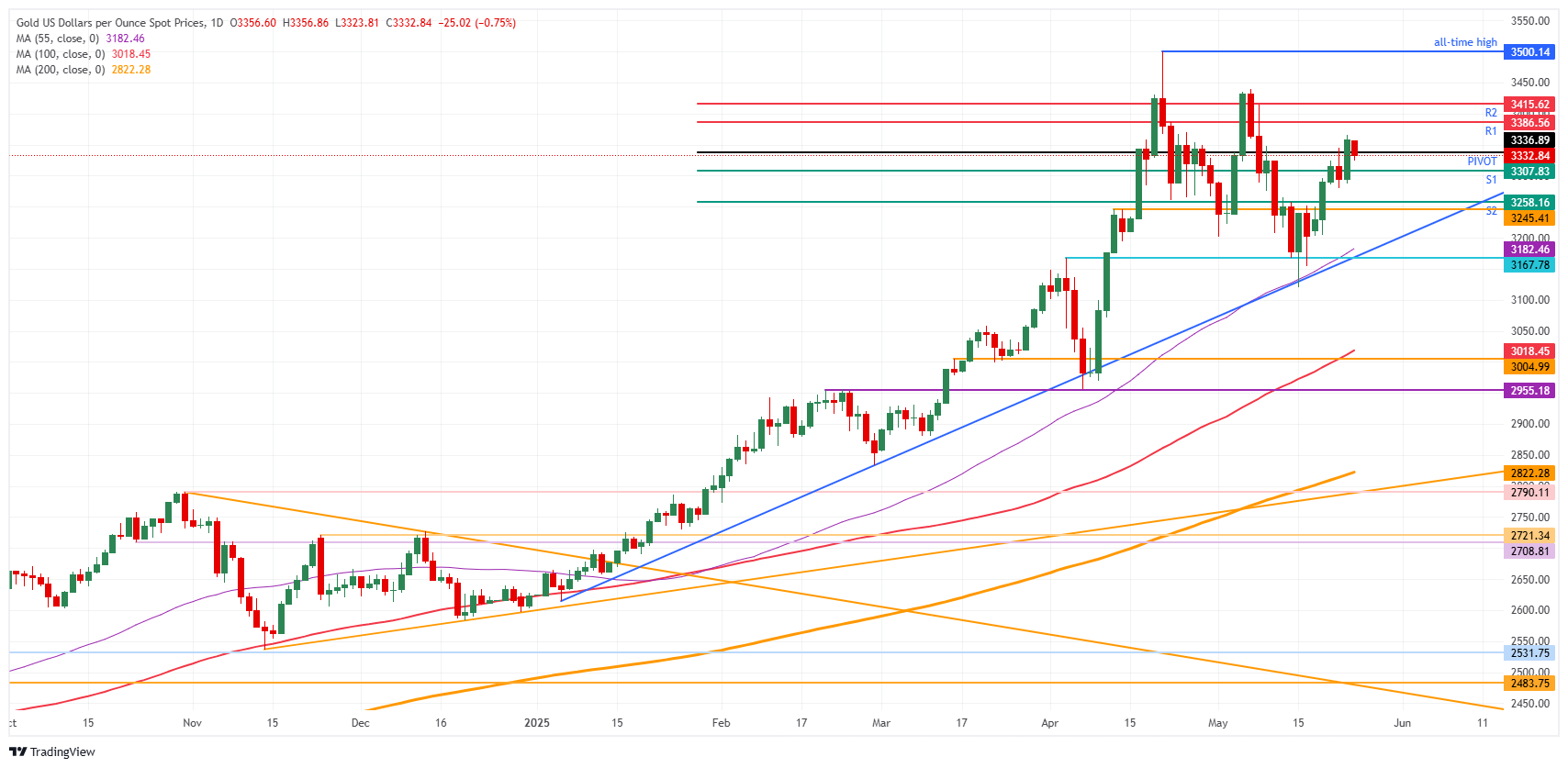 黄金(黄金/美元)价格在周一下滑至3333美元,撰写时美国市场因阵亡将士纪念日公共假期而关闭