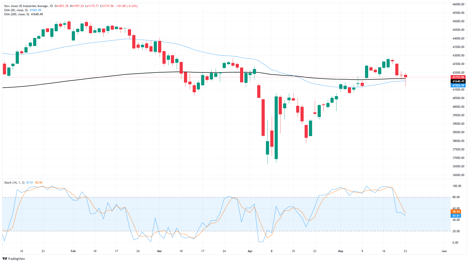 道琼斯工业平均指数(DJIA)在周五的市场交易中遭遇了剧烈的损失,主要股指从高点到低点下跌了780点,触及41,200点后缓慢回升至41,750区域