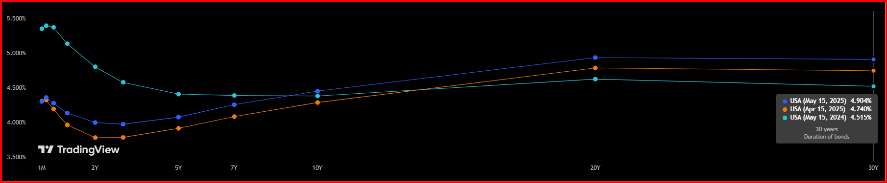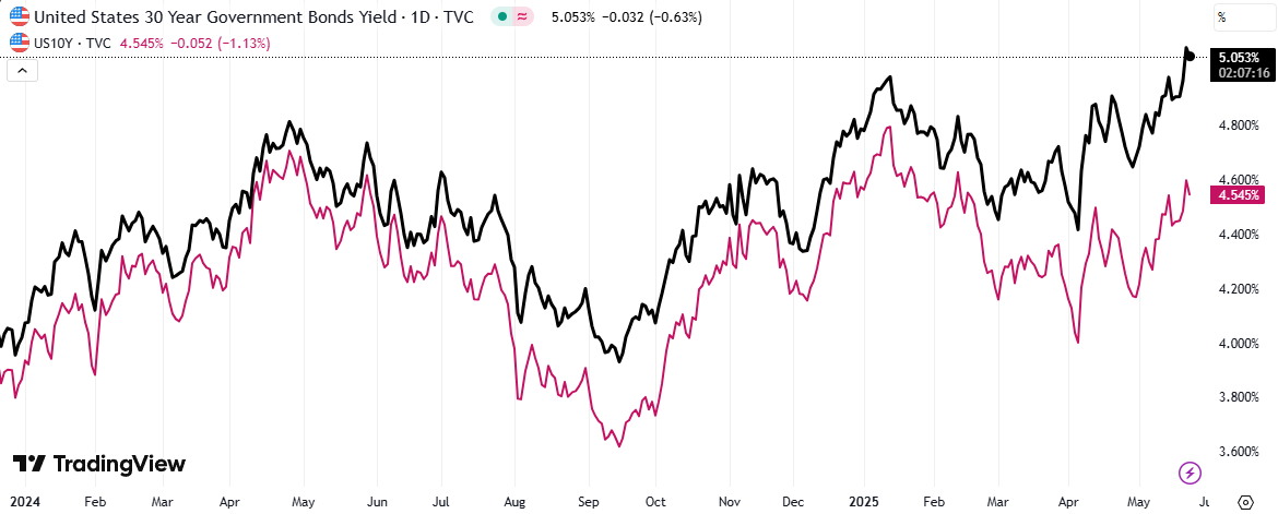 由于特朗普的“一项美丽的大法案”通过了美国众议院并正在前往参议院的途中,市场对美国财政赤字增加的担忧加剧,周四美国国债收益率回落,30年期美国国债收益率达到了19个月来的最高水平。