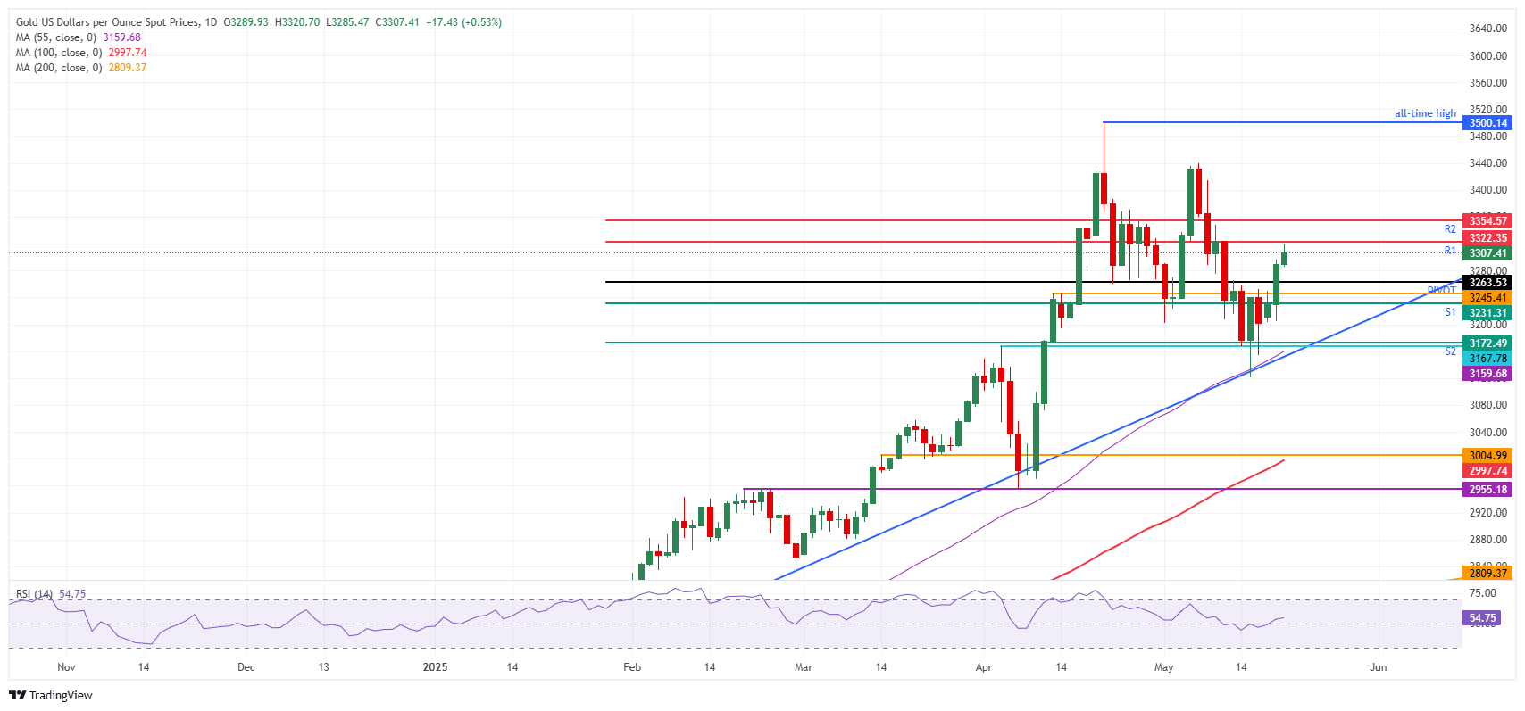 黄金(黄金/美元)在周三小幅上涨,接近3310美元,因人们对中东局势可能再次失控以及特朗普的财政法案可能无法通过国会的严重担忧。
