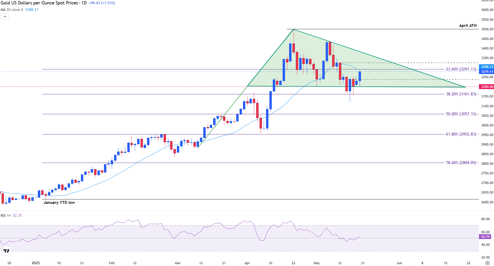 黄金(黄金/美元)价格在周二飙升,受到广泛的美元(USD)疲软和对美国(US)财政健康的重新担忧的提振,此前穆迪在周五下调了美国主权债务评级。