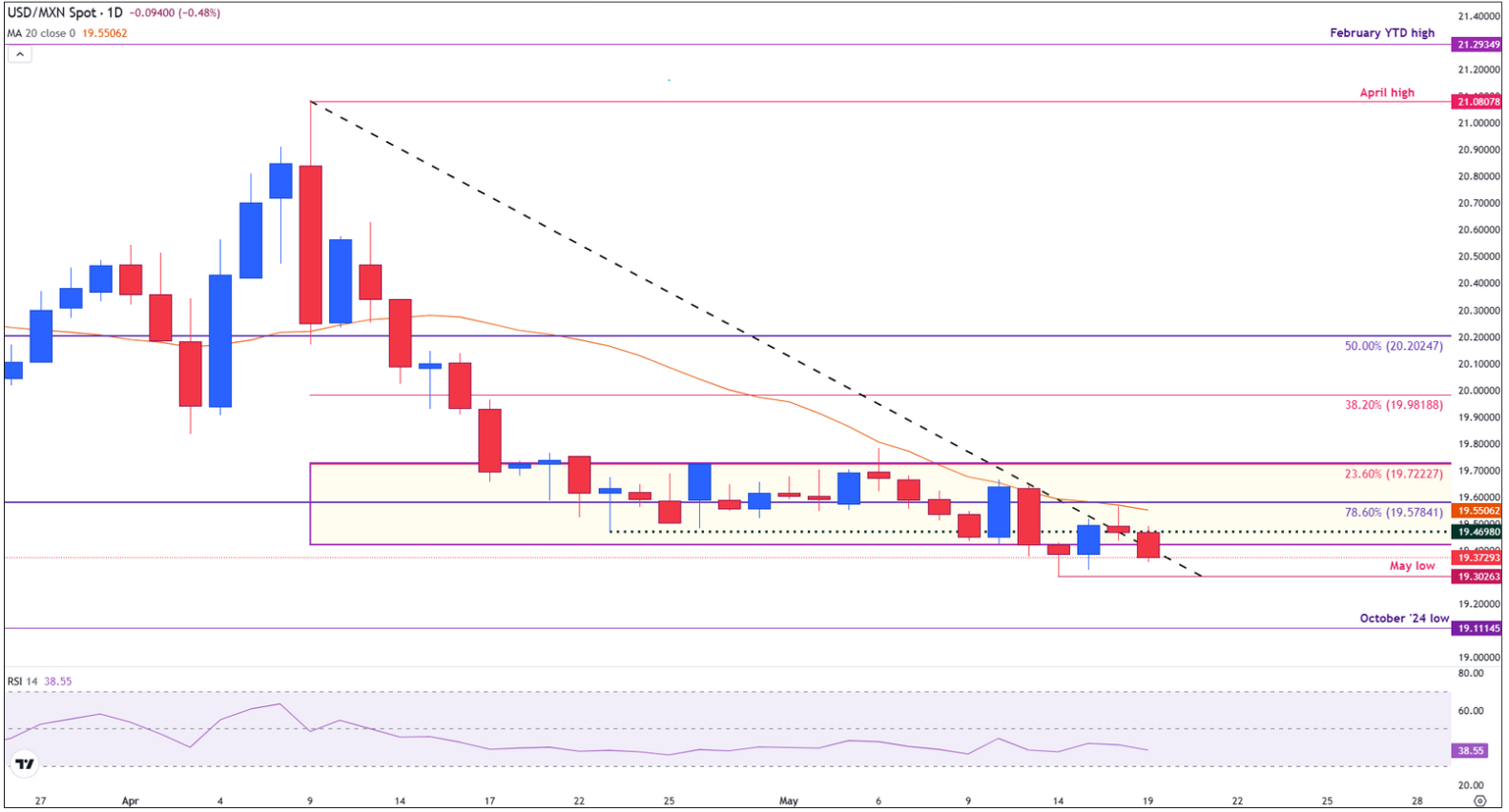 墨西哥比索(MXN)在周一兑美元(USD)上涨了0.60%,因投资者在穆迪国际评级机构对美国政府债务前景进行审查之际转向其他货币。美元/墨西哥比索在触及19.48的日高后,交投于19.32。