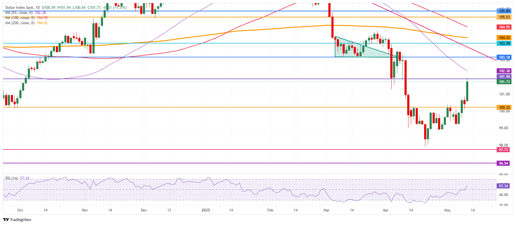 美国美元指数(DXY)追踪美元(USD)对六种主要货币的表现,在周一因中国和美国达成90天暂停贸易战的协议,双方削减关税,涨幅超过1%