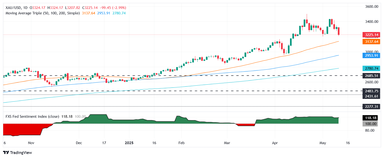 周一金价大幅下跌超过3%,因美国和中国在周末讨论后风险偏好改善,双方同意进行90天的关税减免。撰写时,黄金/美元交易于3225美元,日内最高触及3326美元