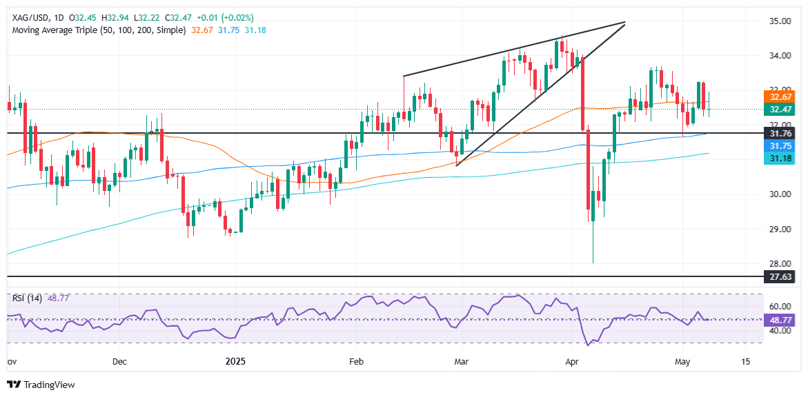 周四,白银价格保持坚挺,因为市场风险偏好因美国与英国贸易协议的消息而改善,同时希望中美紧张局势可能会缓解,因为两国代表团将在本周末在瑞士会晤。撰写时,白银(XAG/USD)交易于32.44美元,下跌0