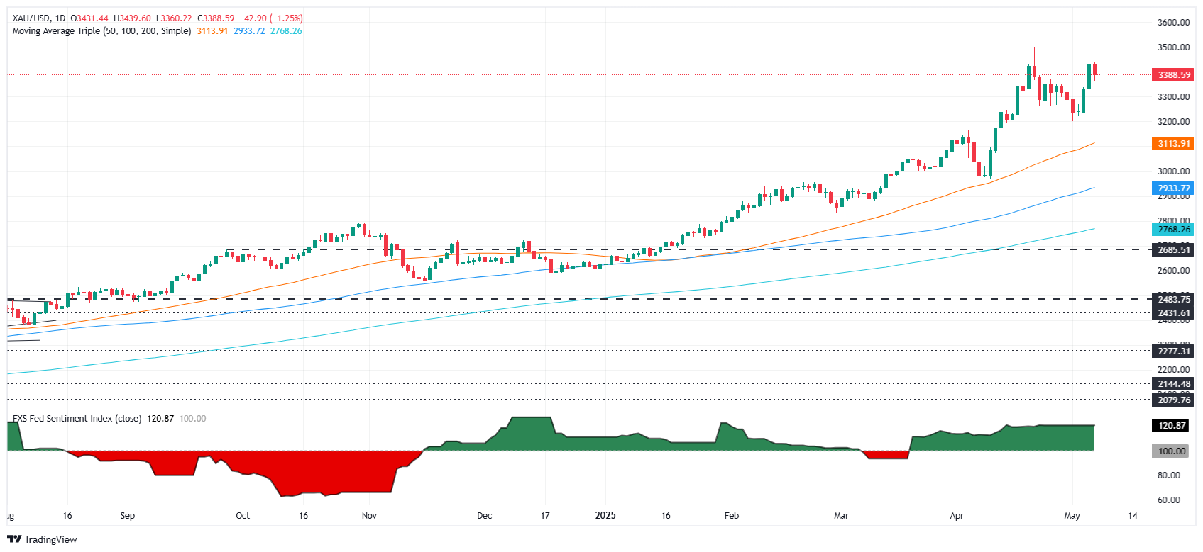 周三,黄金价格回落超过2%,因为美联储(Fed)维持利率不变,尽管在美国(US)与中国开始关税谈判后,风险偏好有所改善